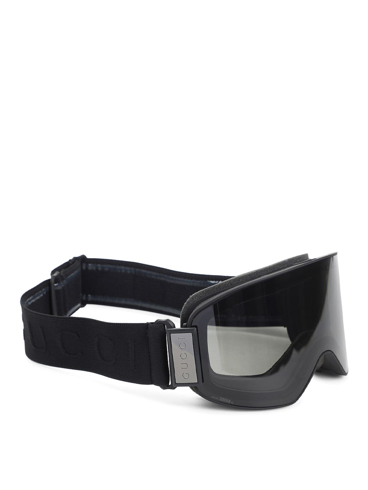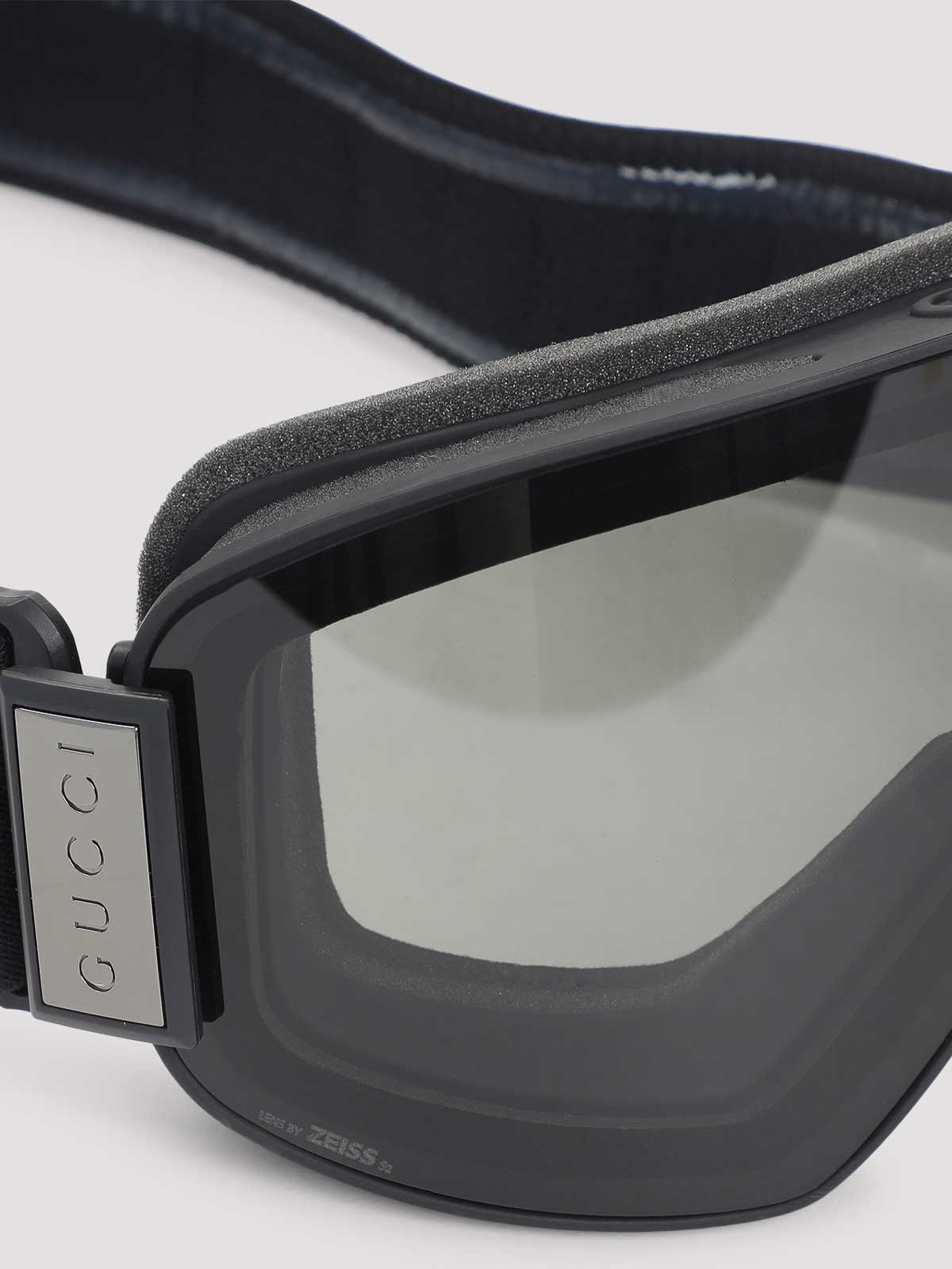 Occhiali da sole nera Gucci Occhiali da sole Black Maschera Design Tonali Templi Top Firma in rilievo GG, Logo Letture Grey Lettering Logo Logo posteriore Grigio Tervo tessile Elastico Modo regolabile