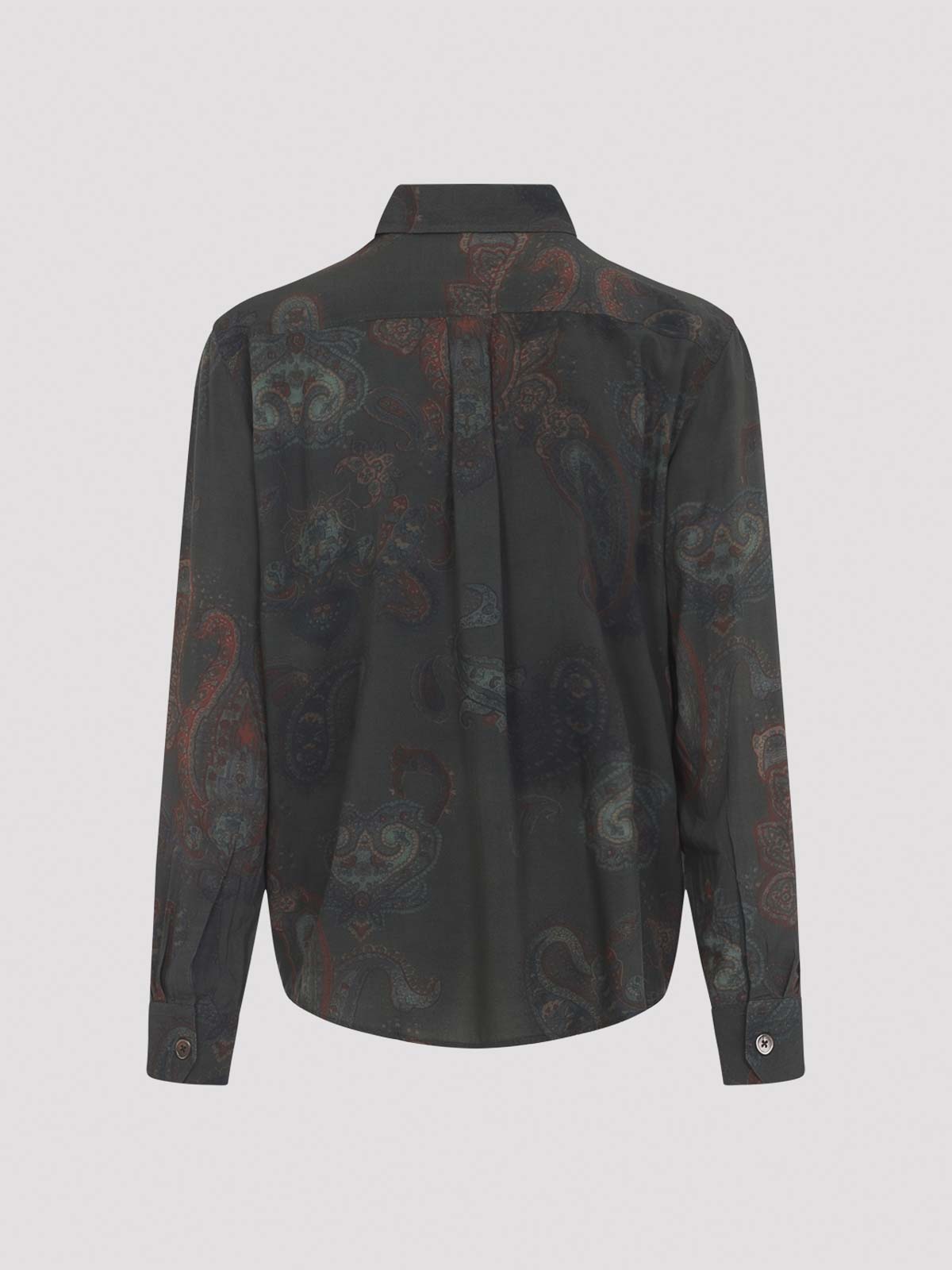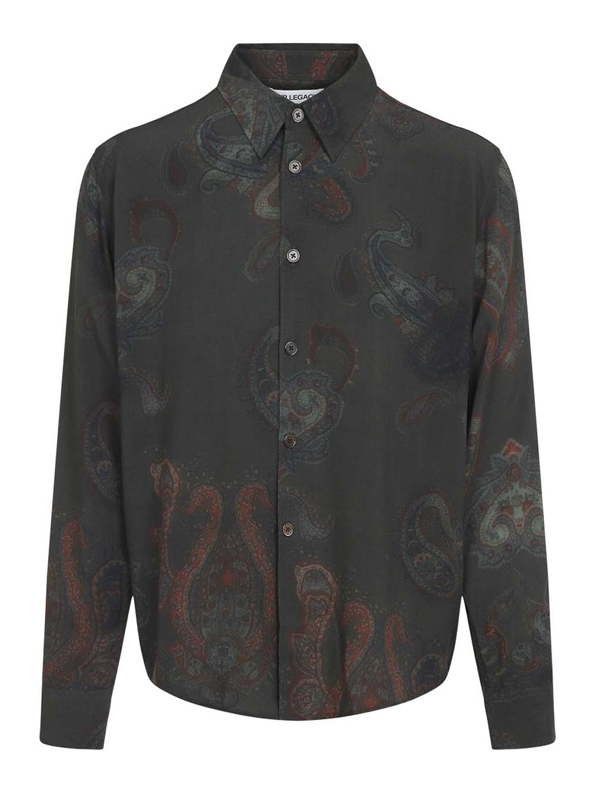 La nostra classica camicia in rayon Beyond con stampa cachemire nera dimenticata. camicia in rayon con stampa cachemire dimenticato nero puro. colletto a punta, chiusura frontale con bottoni, maniche lunghe, polsini con bottoni, fondo stondato. sfondo nero con disegno paisley stampato multicolor.