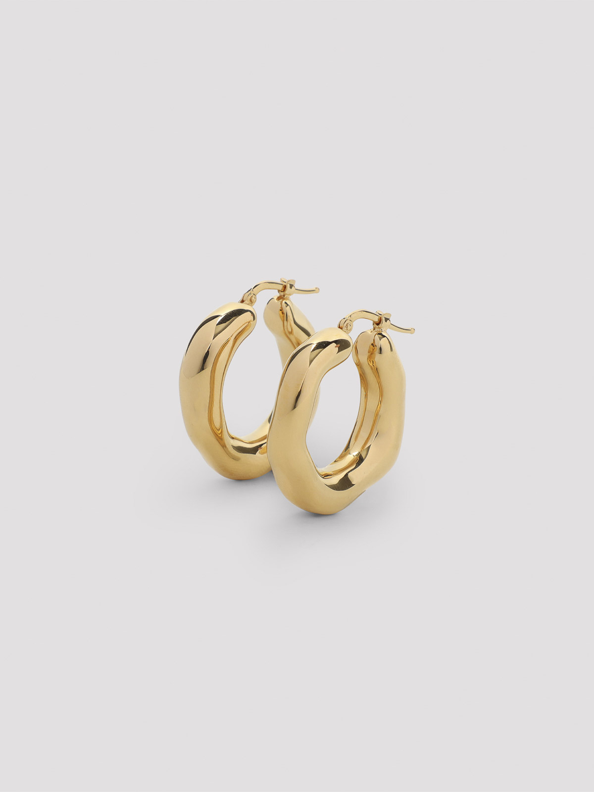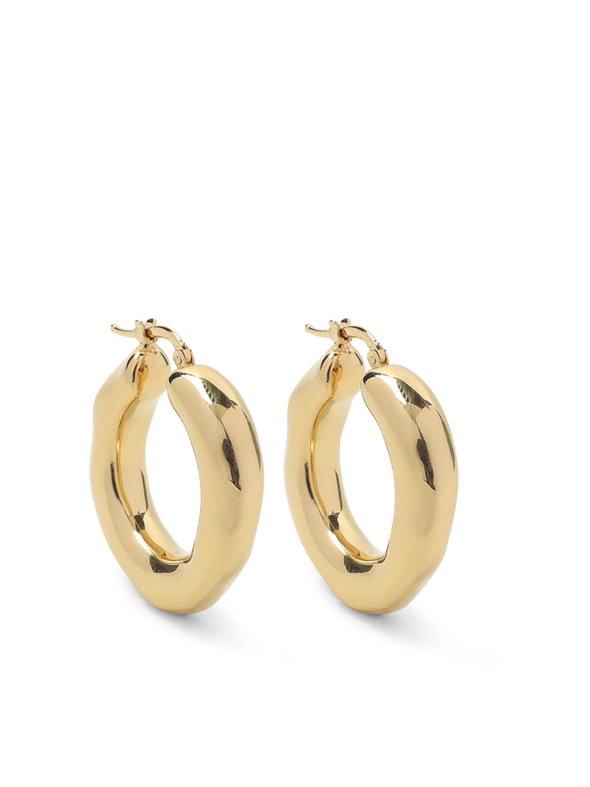 Orecchini in ottone dorato Jil Sander. orecchini a cerchio realizzati in ottone dorato, caratterizzati da superfici irregolari, classica chiusura superiore, per lobi forati.