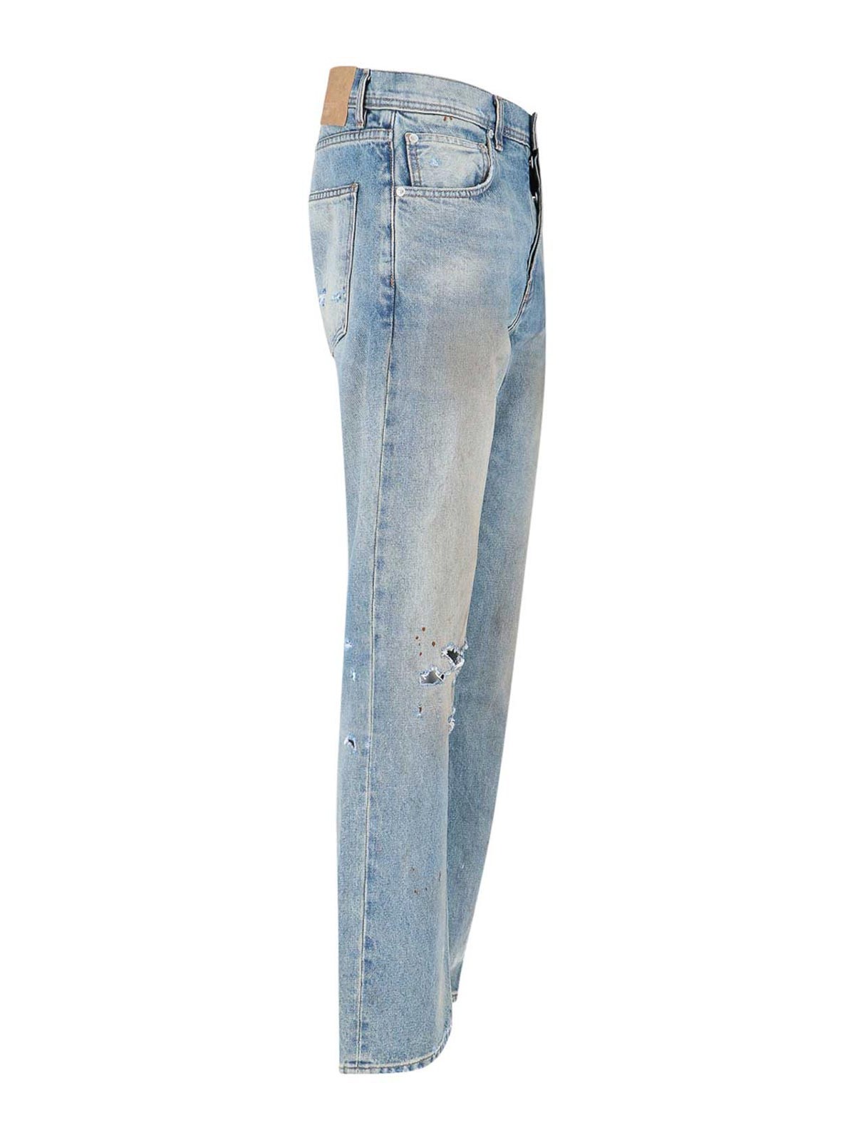Jeans palazzo enfants riches dprims, in denim azzurro, lavaggio usured, dettagli distressed all-over, vita media, passanti cintura, chiusura bottoni, design cinque tasche, patch logo retro, taglio vivo su fondo, gamba dritta.