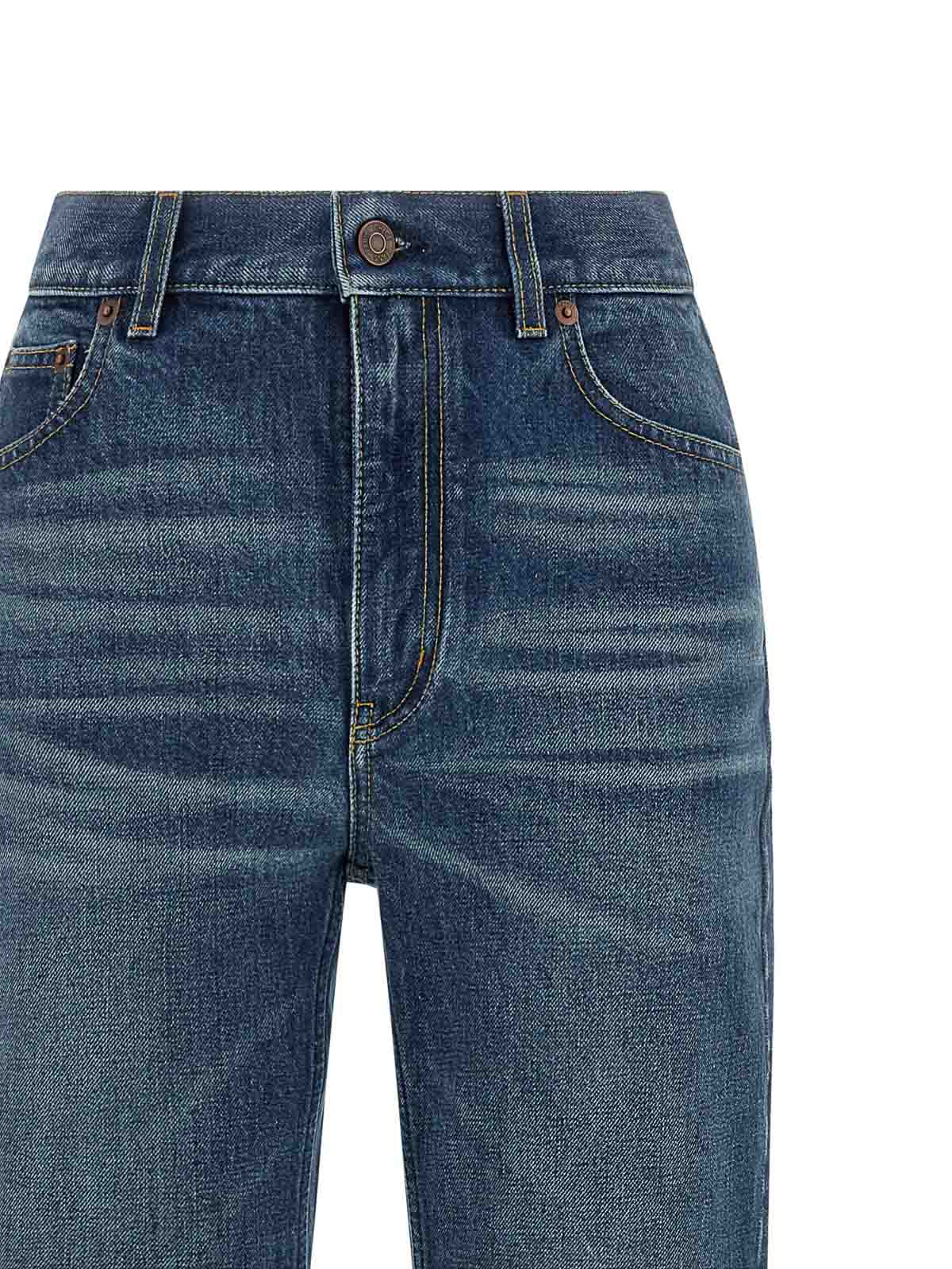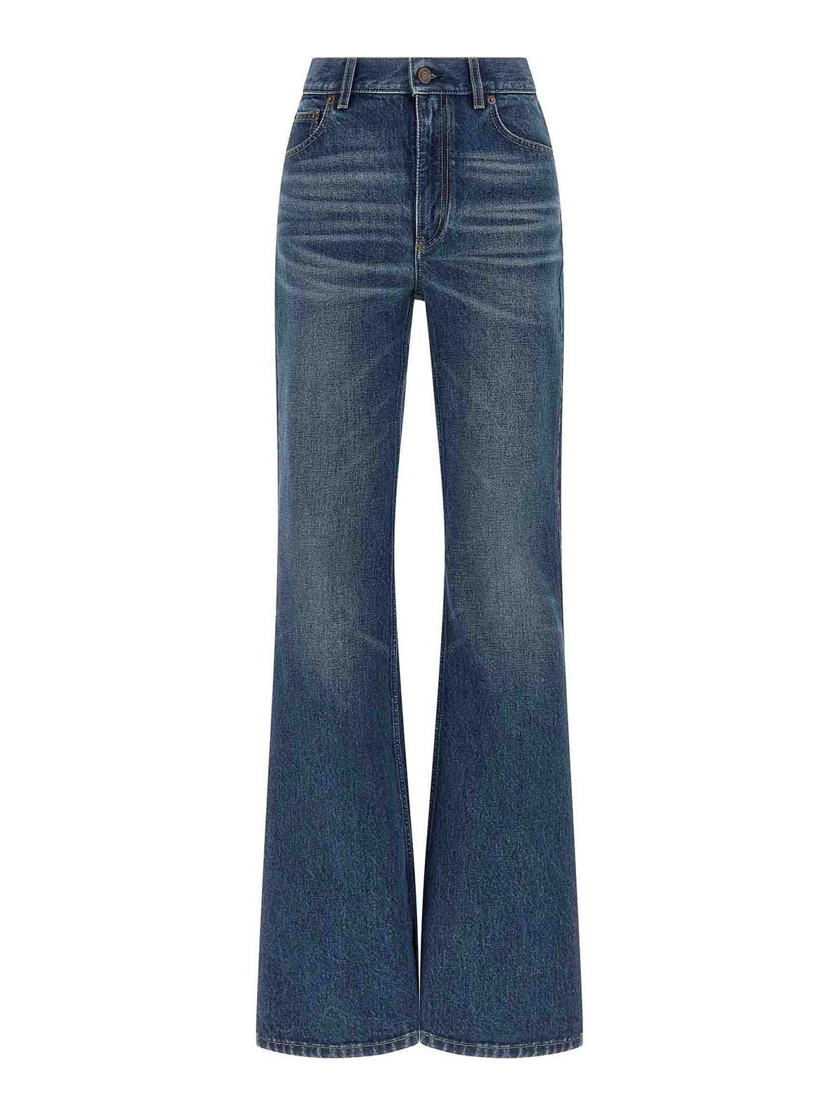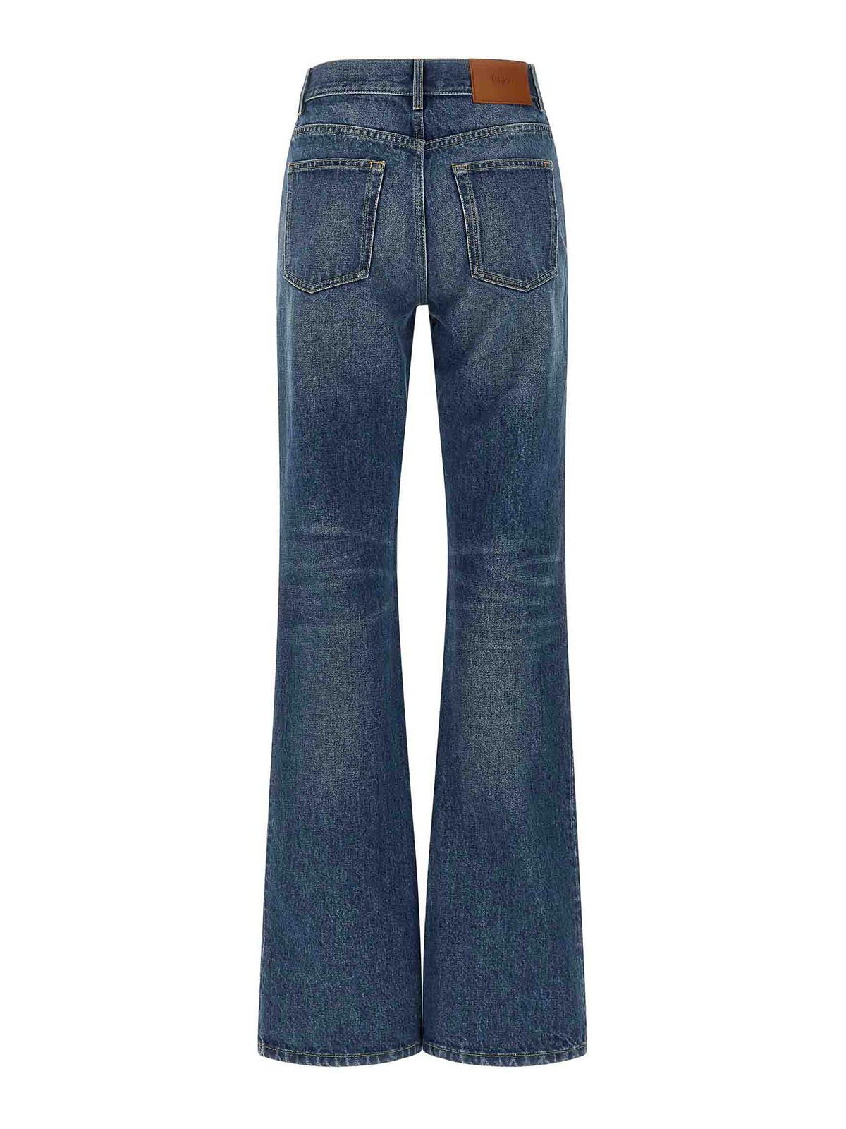 Jeans in denim di cotone stone wash con cuciture a contrasto, gamba a palazzo, vita media, chiusura frontale con zip e bottone, cinque tasche ed etichetta logo in pelle sul retro.