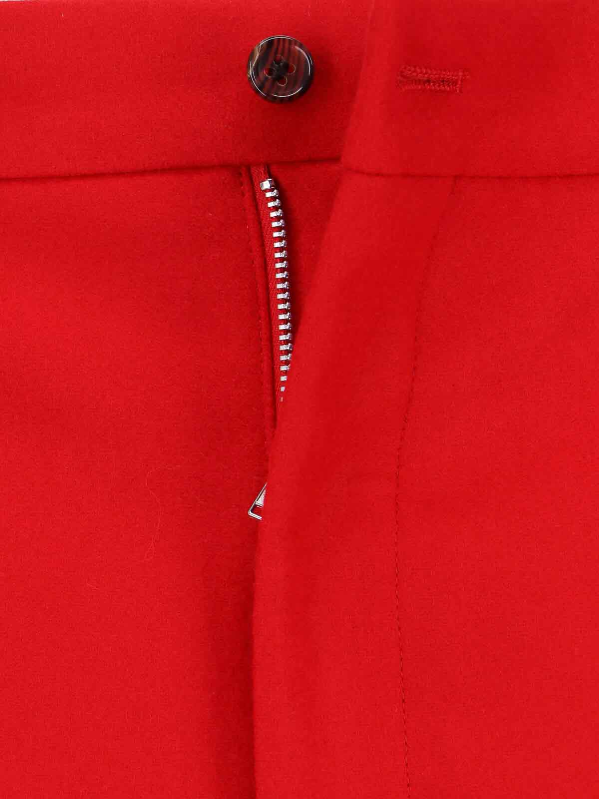 Pantaloncini in lana comme des garcons, rossi, passanti cintura, chiusura bottone e zip, pinces fronte, una tasca bottone retro, una tasca piatta retro, gamba dritta.