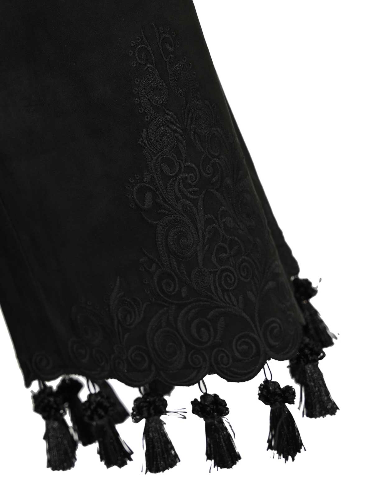 Pantalone da donna in misto cotone con nappine, amosa, modello a25fwpa09, tessuto: misto cotone effetto suede, fantasia: tinta unita nera, vita: media, con cinturino e bottone frontale rivestito, chiusura: zip frontale con doppio bottone, tasche: due tasche laterali a filetto e due finte tasche posteriori, lunghezza: cropped, gamba ampia, dettagli: ricamo decorativo tono su tono sul fondo gamba, nappine applicate lungo lorlo, elasticatura posteriore in vita per maggiore comfort, foderato: no, vestibilità: regolare