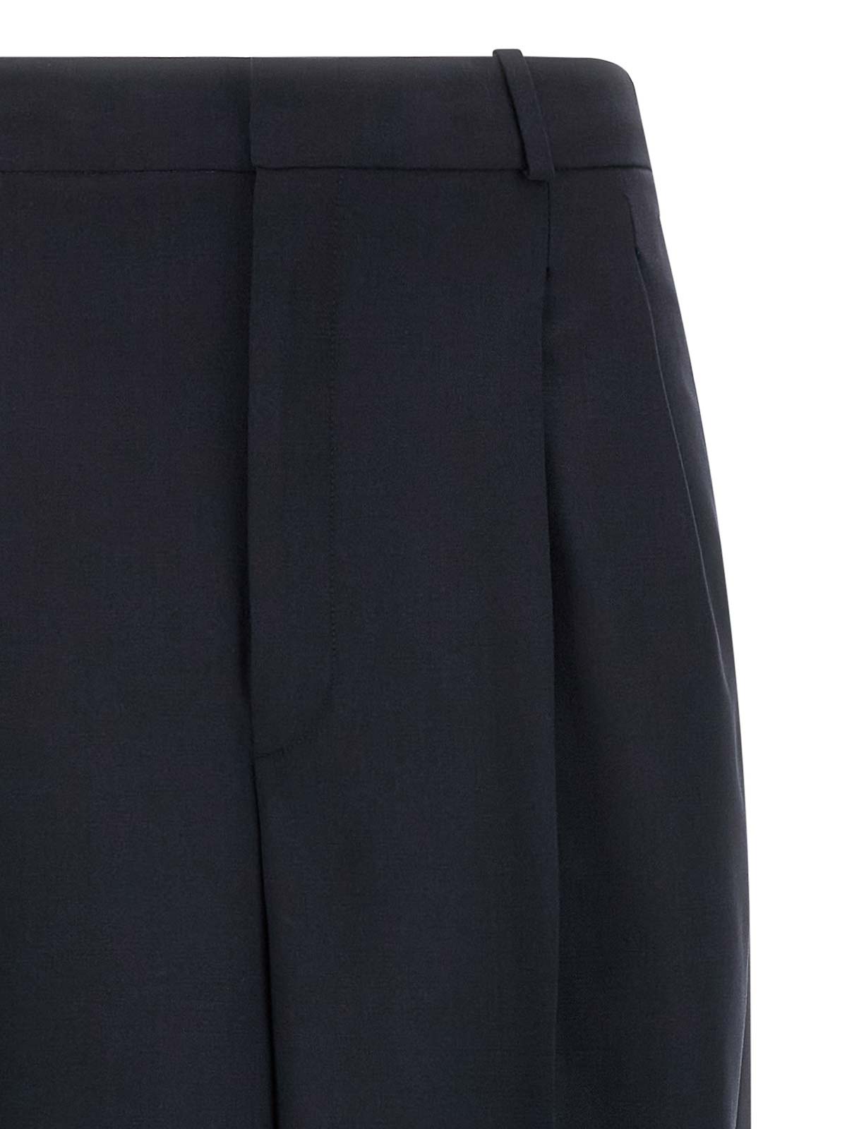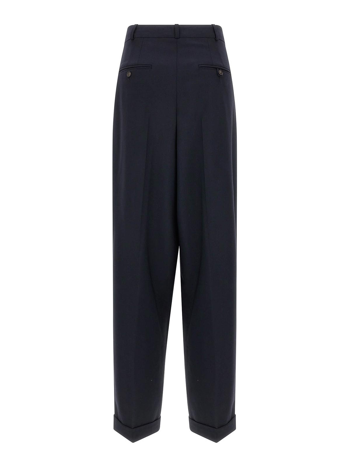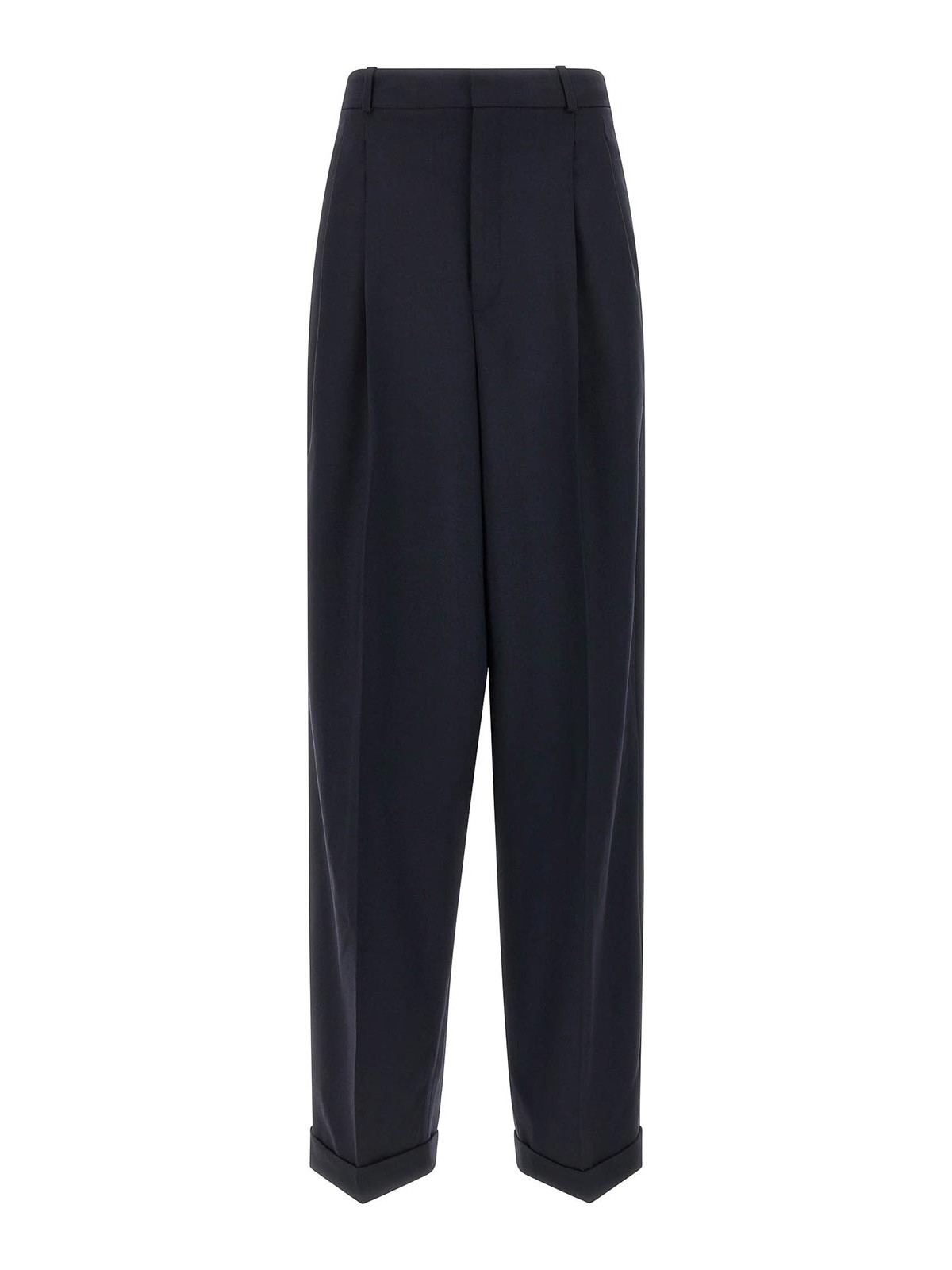 Pantaloni di lana, vita media, gamba larga, spille, piega con stiratura, chiusura di zip e bottone anteriore, tasche, accensione sul fondo della gamba.