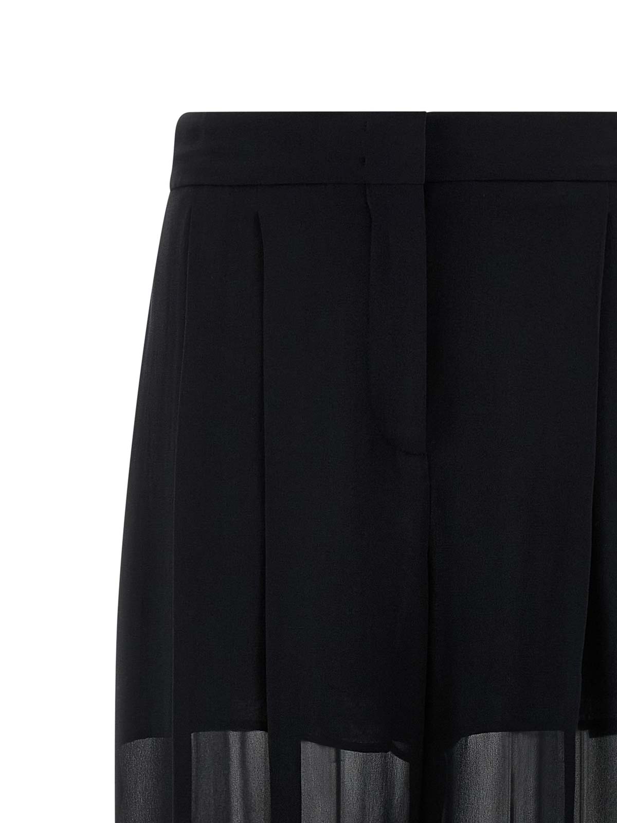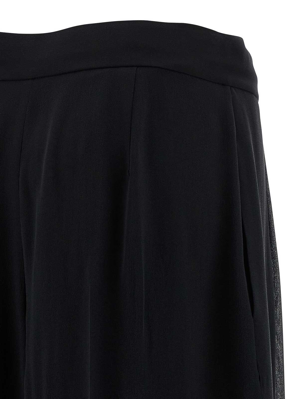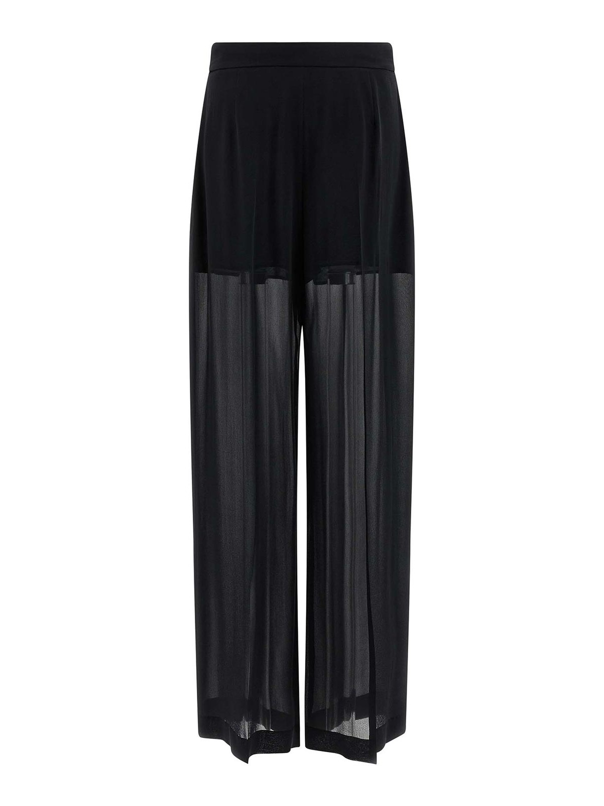 Pantaloni in georgette di seta semitrasparente, modello palazzo, gamba ampia con fodera interna a pantaloncino, doppie pinces, chiusura con zip e gancio, tasche.