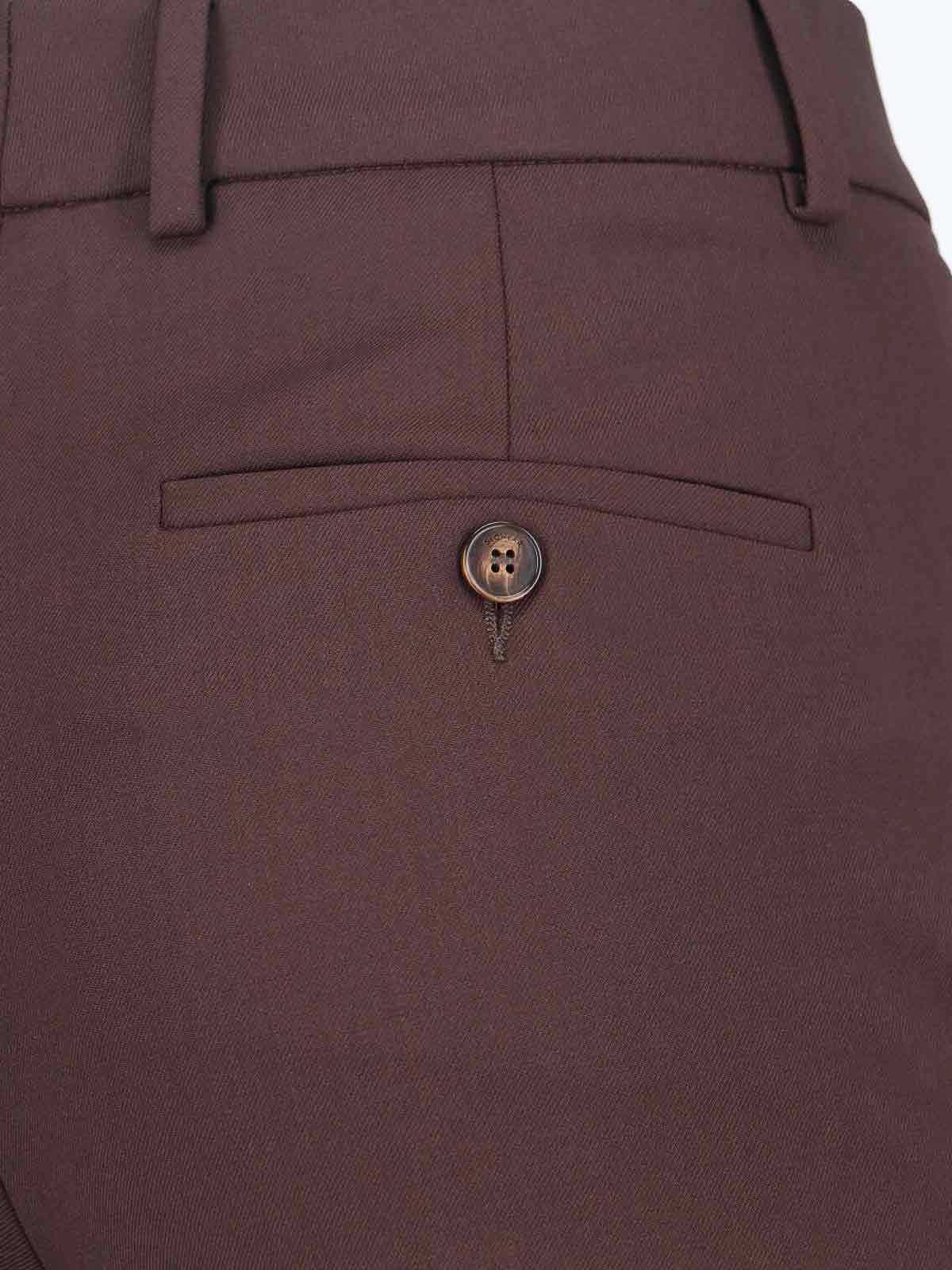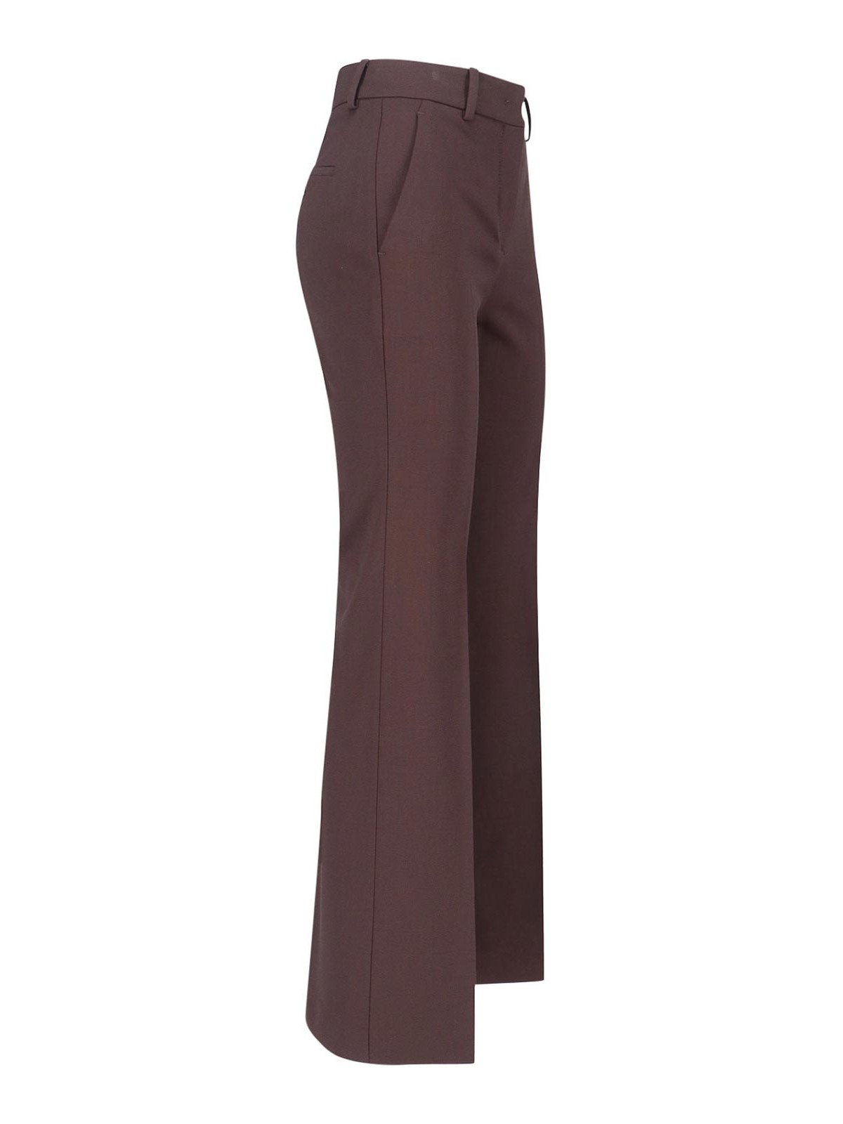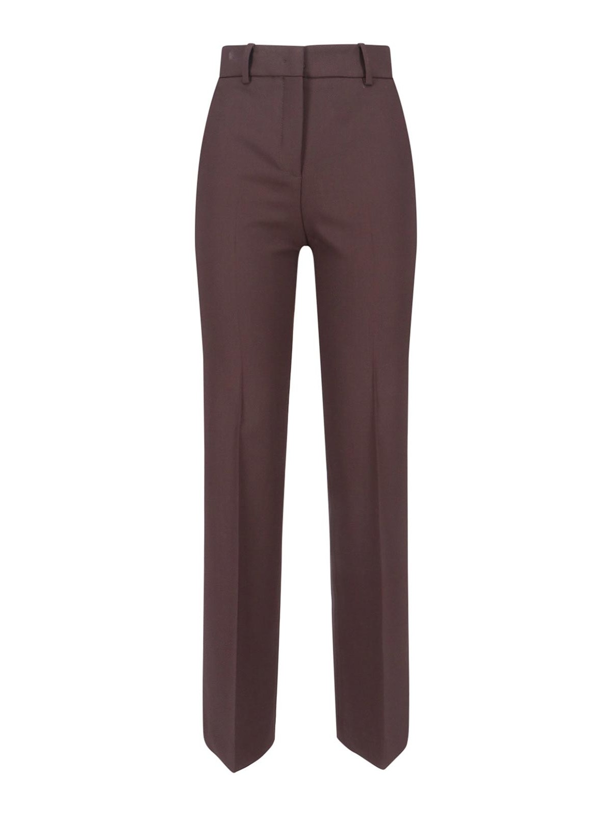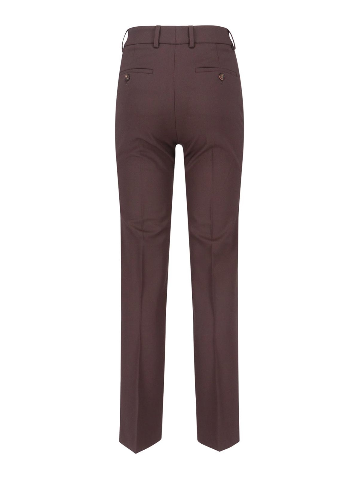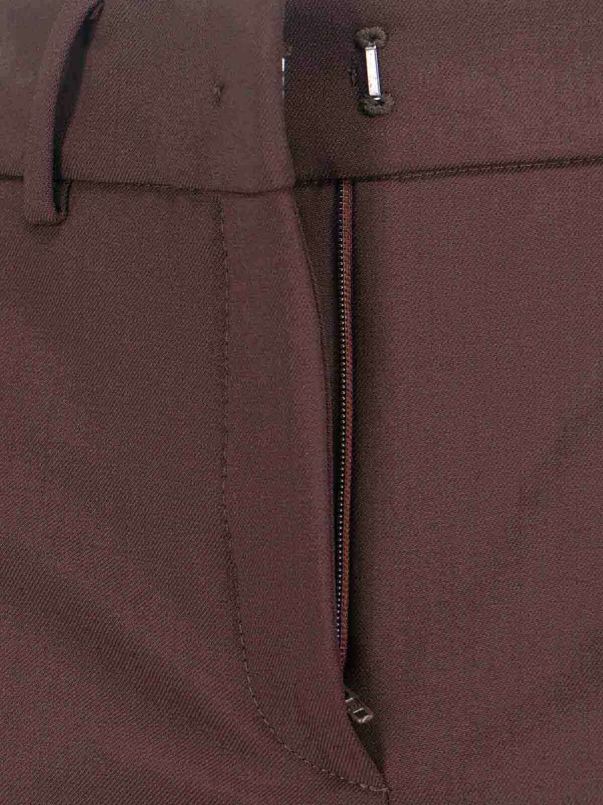 Pantaloni dritti incotex, in lana vergine marrone, vita media, passanti cintura, chiusura ganci e zip, due tasche laterali, due tasche filetto bottone retro, gamba dritta.