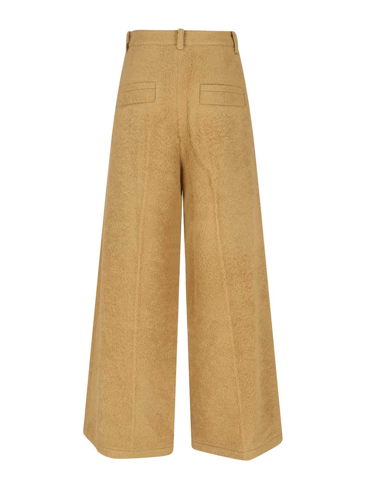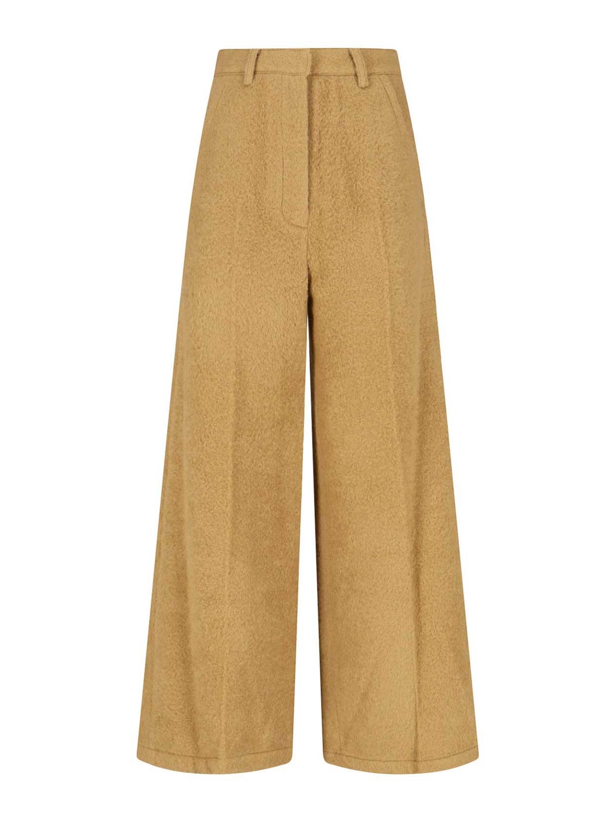 Pantaloni in misto lana e alpaca low classic, beige, vita media, passanti cintura, chiusura bottone a pressione e zip, due tasche laterali, due tasche retro, gamba ampia.
