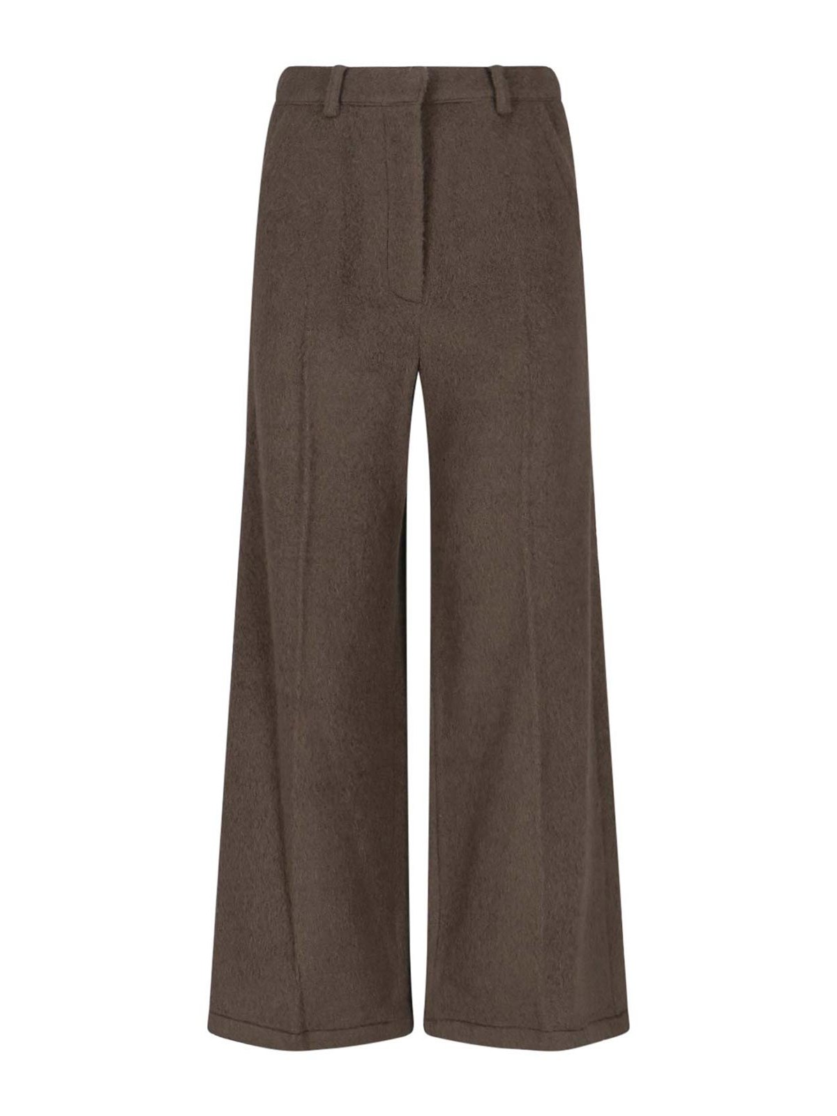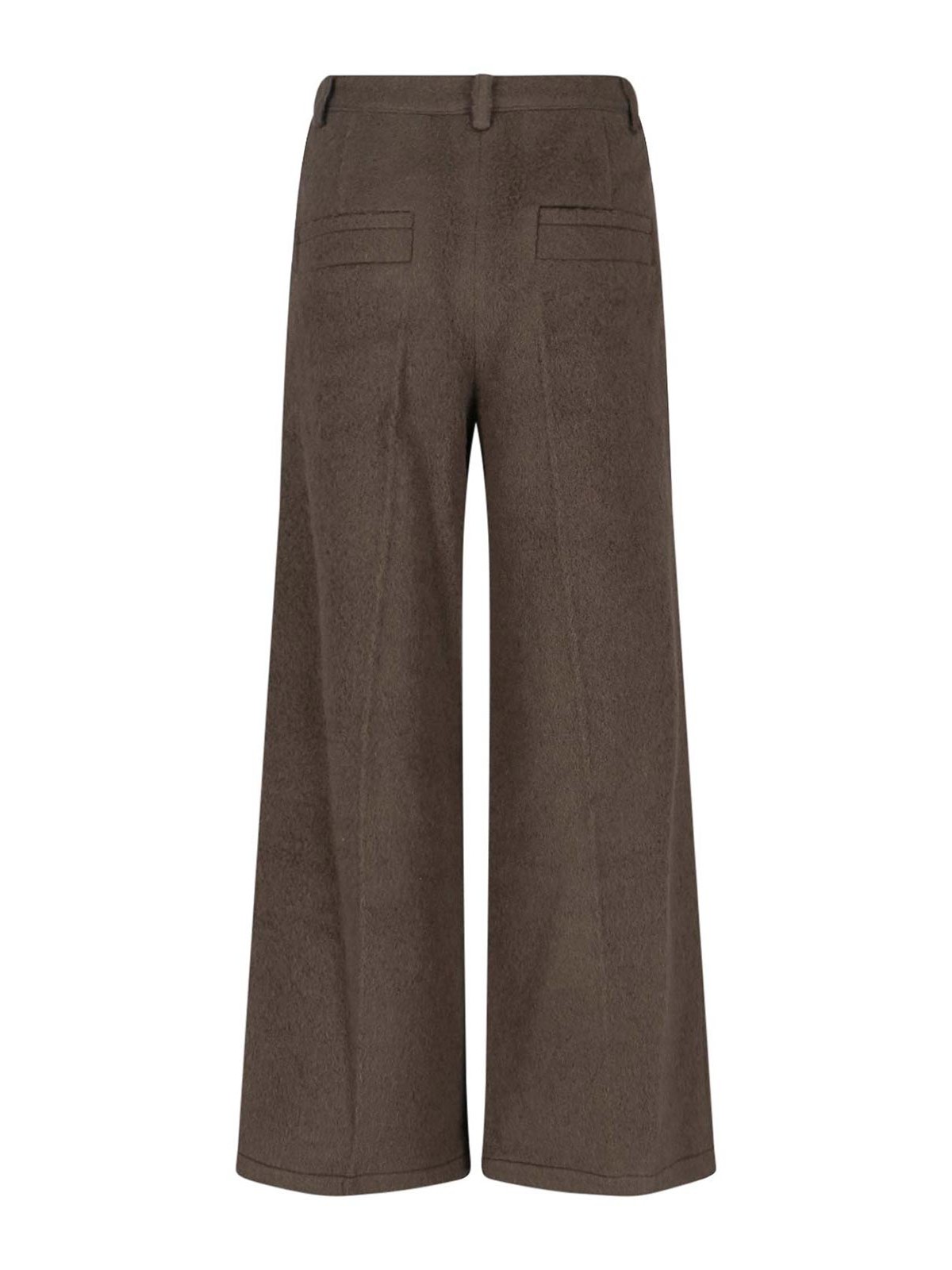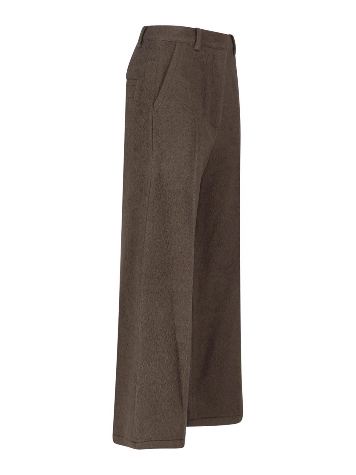 Pantaloni in misto lana e alpaca low classic, marroni, vita media, passanti cintura, chiusura bottone a pressione e zip, due tasche laterali, due tasche retro, gamba ampia.