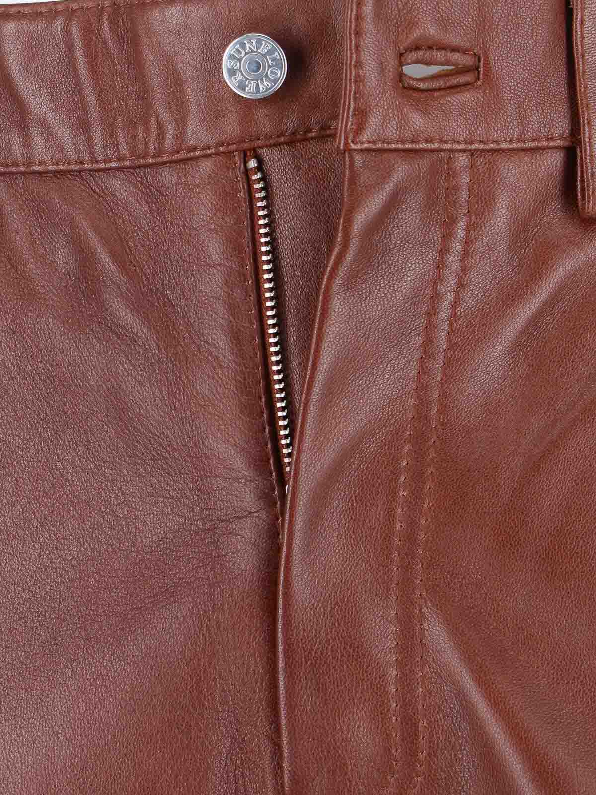 Pantaloni in pelle di agnello sunflower, marrone, tonalit cognac, vita alta, passanti cintura, chiusura bottone e zip, design a cinque tasche, dettaglio finiture in rilievo , gamba dritta.