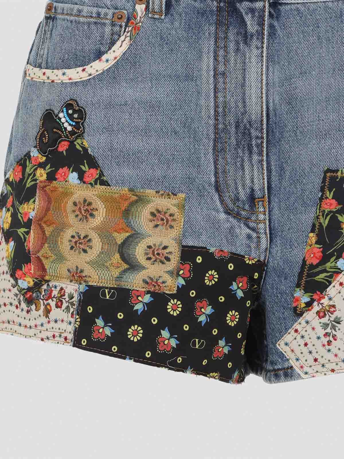 Shorts Valentino in cotone blu patchwork. realizzato in denim di cotone blu medio, caratterizzato da vita alta, passanti per cintura, chiusura frontale con bottone e zip, dettagli patchwork multi-stampa, dettaglio ricamo di perline ed etichetta in pelle con marchio sul retro della vita.