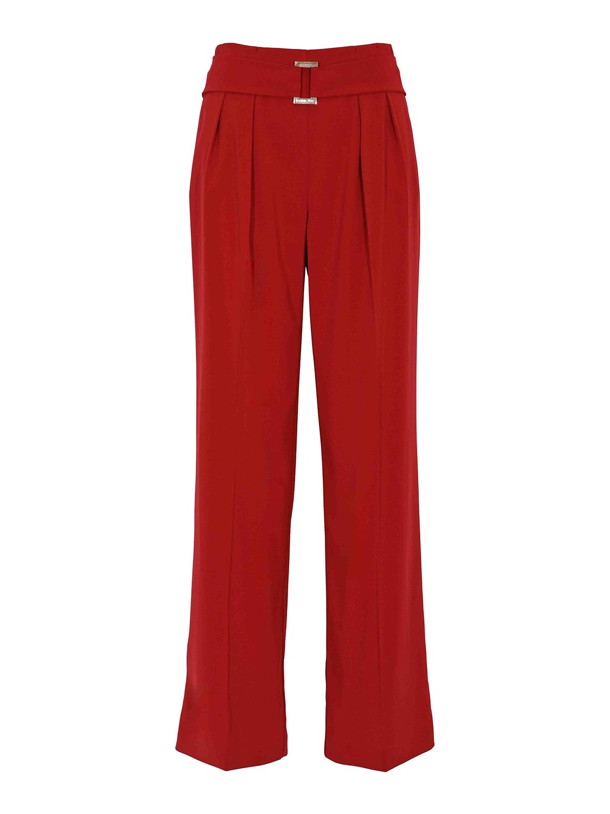 Pantalone in crepe stretch con fibbia e pinces patrizia pepe fantasia crepe stretch tinta unita rosso vita alta, sfiancato con fibbia sul fondo con zip nascosta e tasche con gancetto tasche inserite laterali e tasche posteriori a filetto lunghezza pinces lunghe vestibilità ampia e fluida logo patrizia pepe applicato foderato si vestibilità regolare