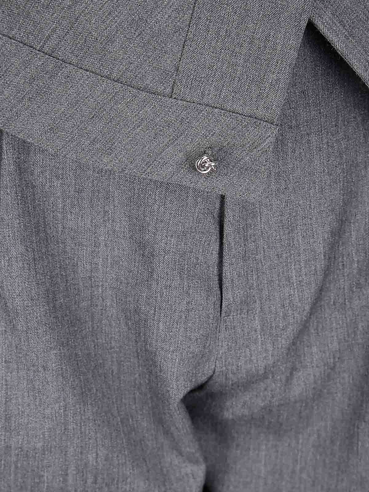 Pantaloni gamba larga, tasche laterali, cintura con piega sul davanti, bottone a nodo sul davanti color argento.