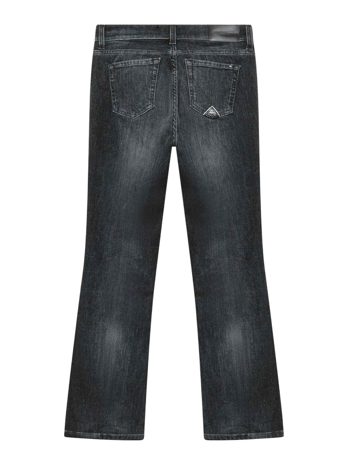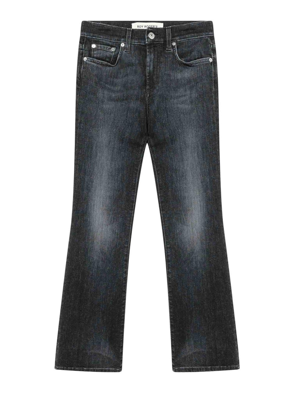 Roy rogers jeans donna zandra hem camarillo in denim stretch nero jeans donna firmati roy rogers realizzati in denim stretch tinta unita, caratterizzati da un lavaggio uniforme e una vestibilita' moderna. il modello zandra presenta vita media con passanti, chiusura con bottone logato e zip, e un taglio bootcut che slancia la figura con eleganza. le due tasche sul fronte e le due tasche sul retro con label roy rogers applicata completano il design con i dettagli iconici del brand. un capo versatile e femminile, perfetto per look quotidiani dal gusto raffinato.