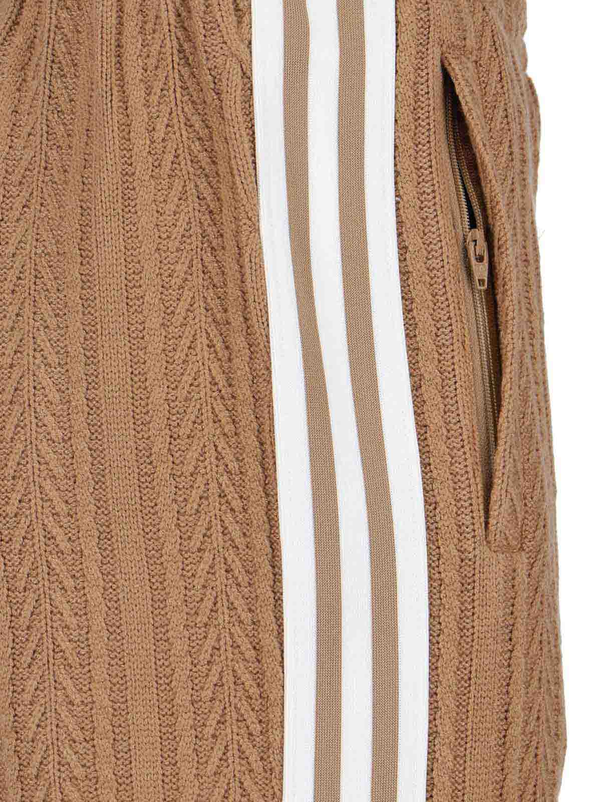 Pantaloni sportivi adidas, in misto viscosa marrone, lavorazione a maglia, vita media elastica, tasche laterali, logo a contrasto fronte, bande iconiche laterali, gamba dritta.
