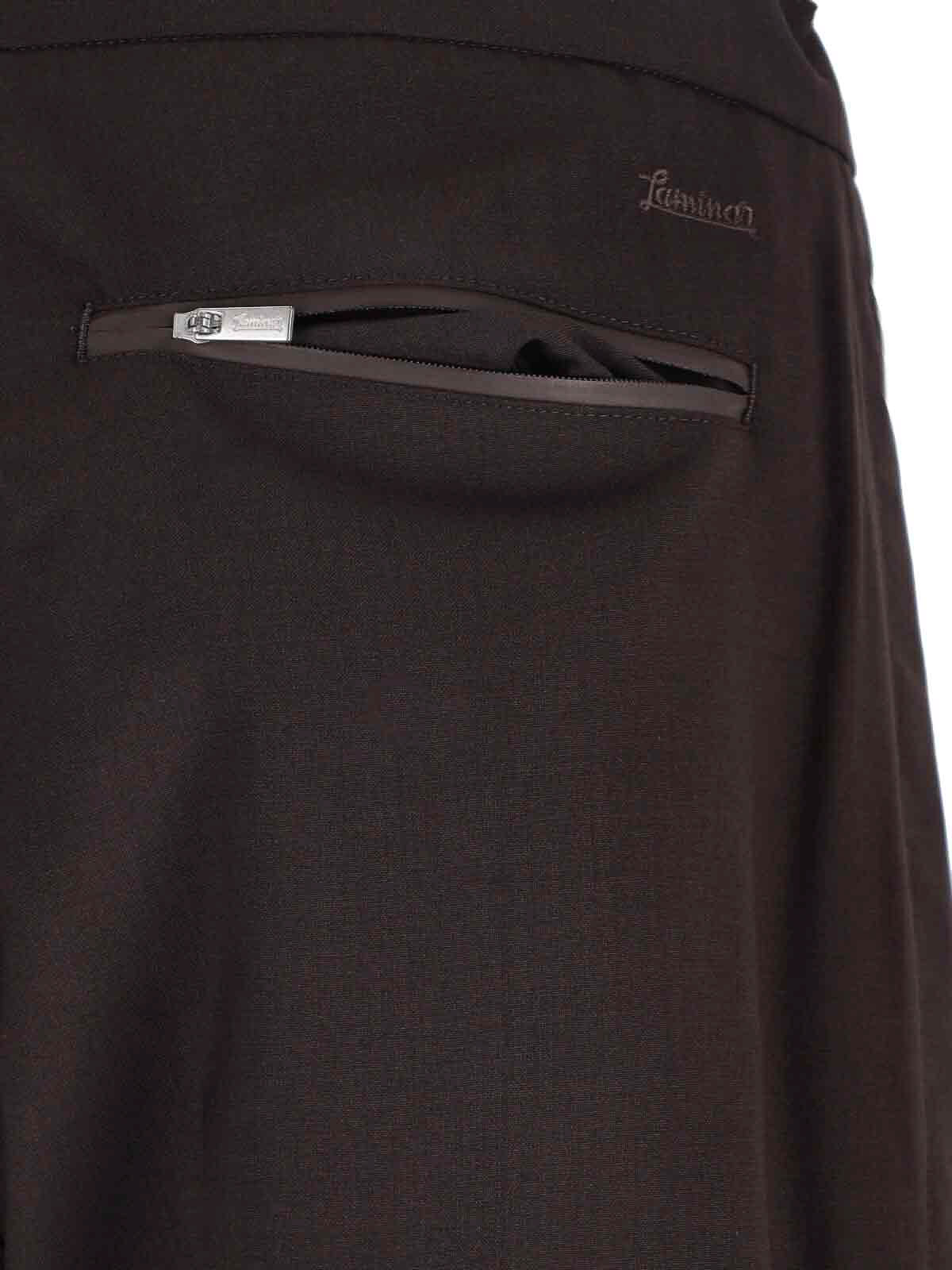 Pantaloni sportivi laminar, in misto lana vergine marrone, tonalit scura, vita media, coulisse su vita, chiusura bottone e zip, due tasche zip laterali, ricamo logo tono su tono retro, una tasca zip retro, gamba dritta.