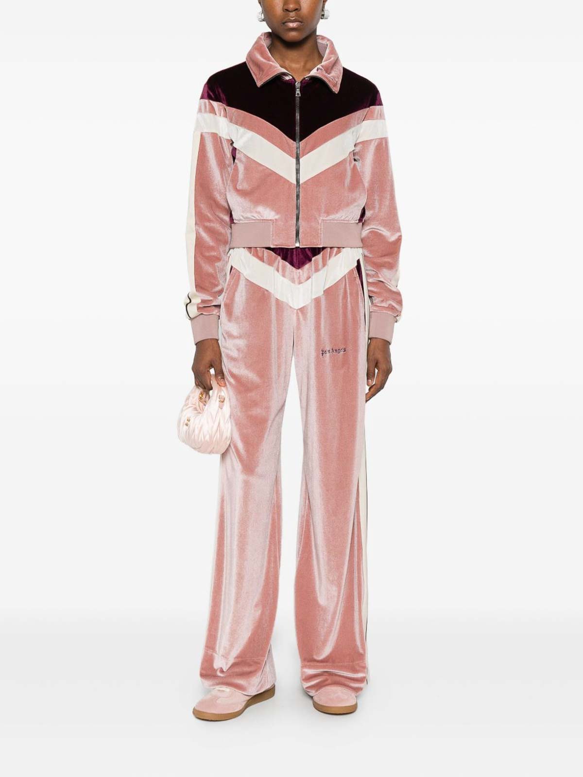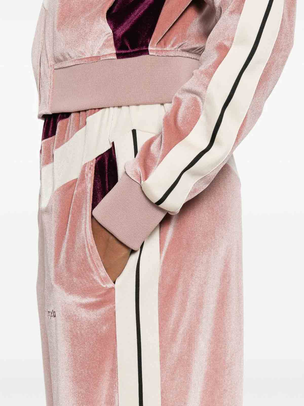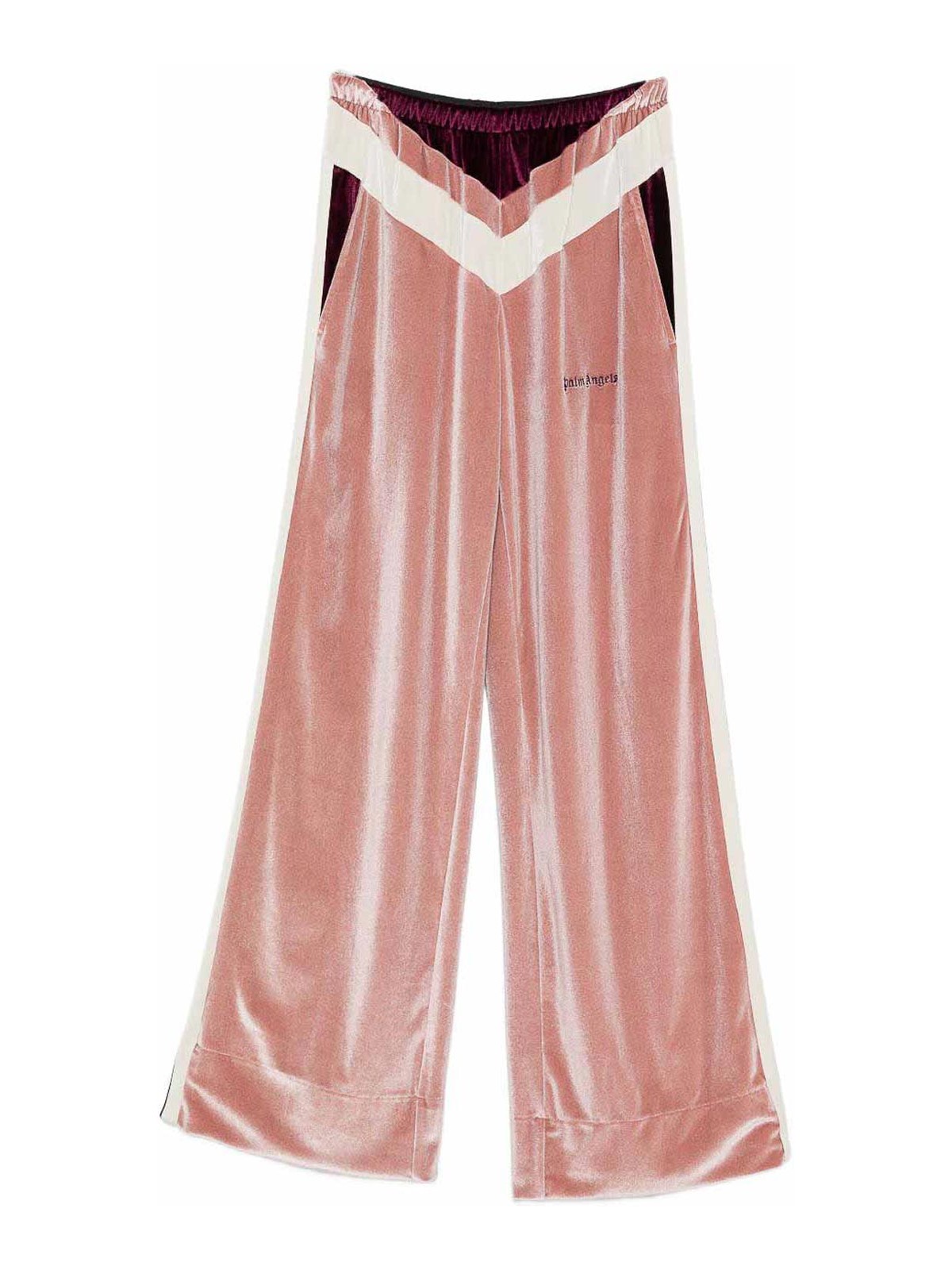 Pantaloni sportivi in ​​ciniglia rosa rosa di Palm Angels caratterizzati da una morbida finitura testurizzata, strisce laterali a contrasto, cintura elasticizzata e tasche laterali a fessura, un capo accogliente ed elegante che combina vibrazioni di abbigliamento sportivo retrò con il caratteristico tocco urbano del marchio.