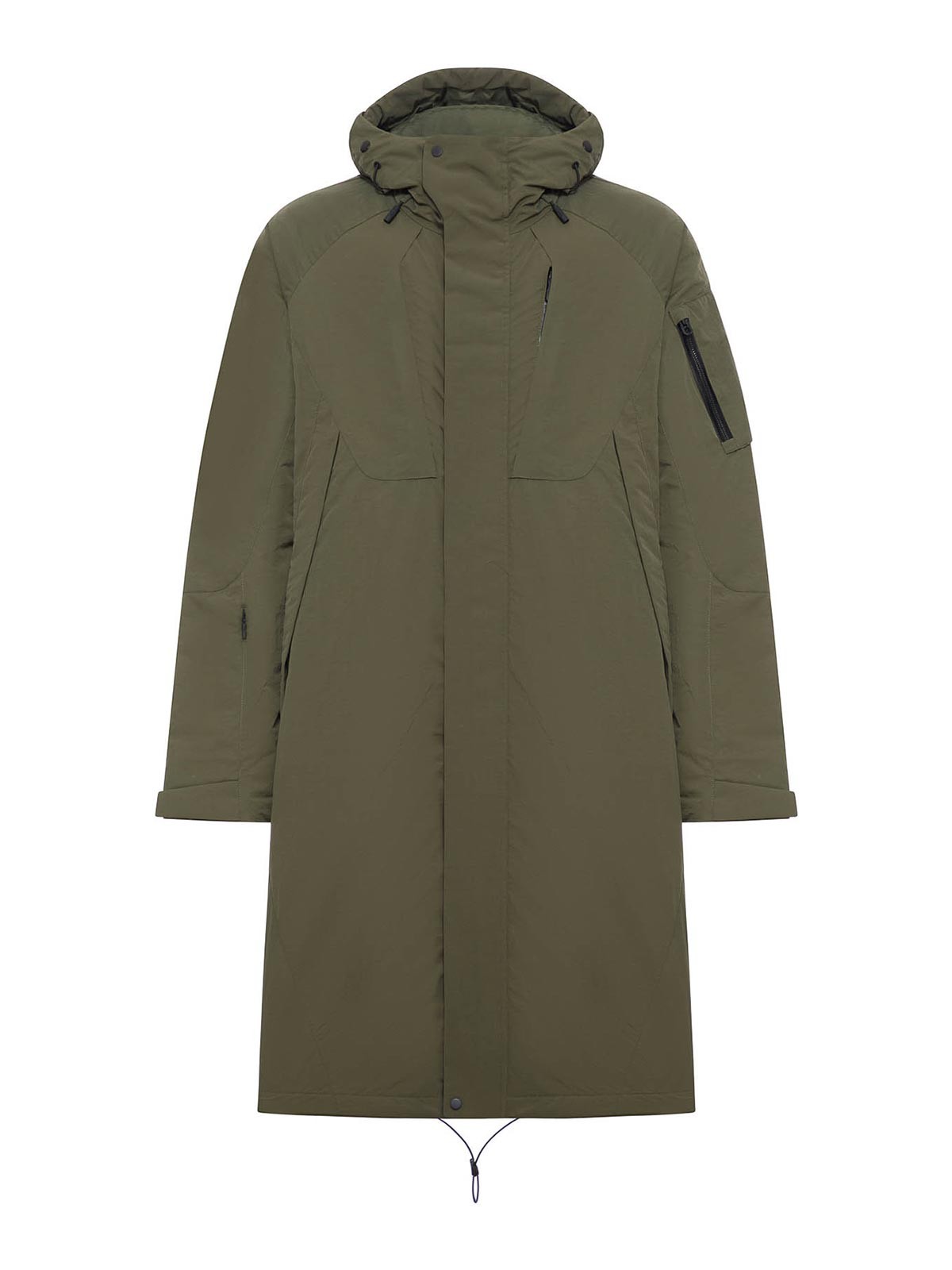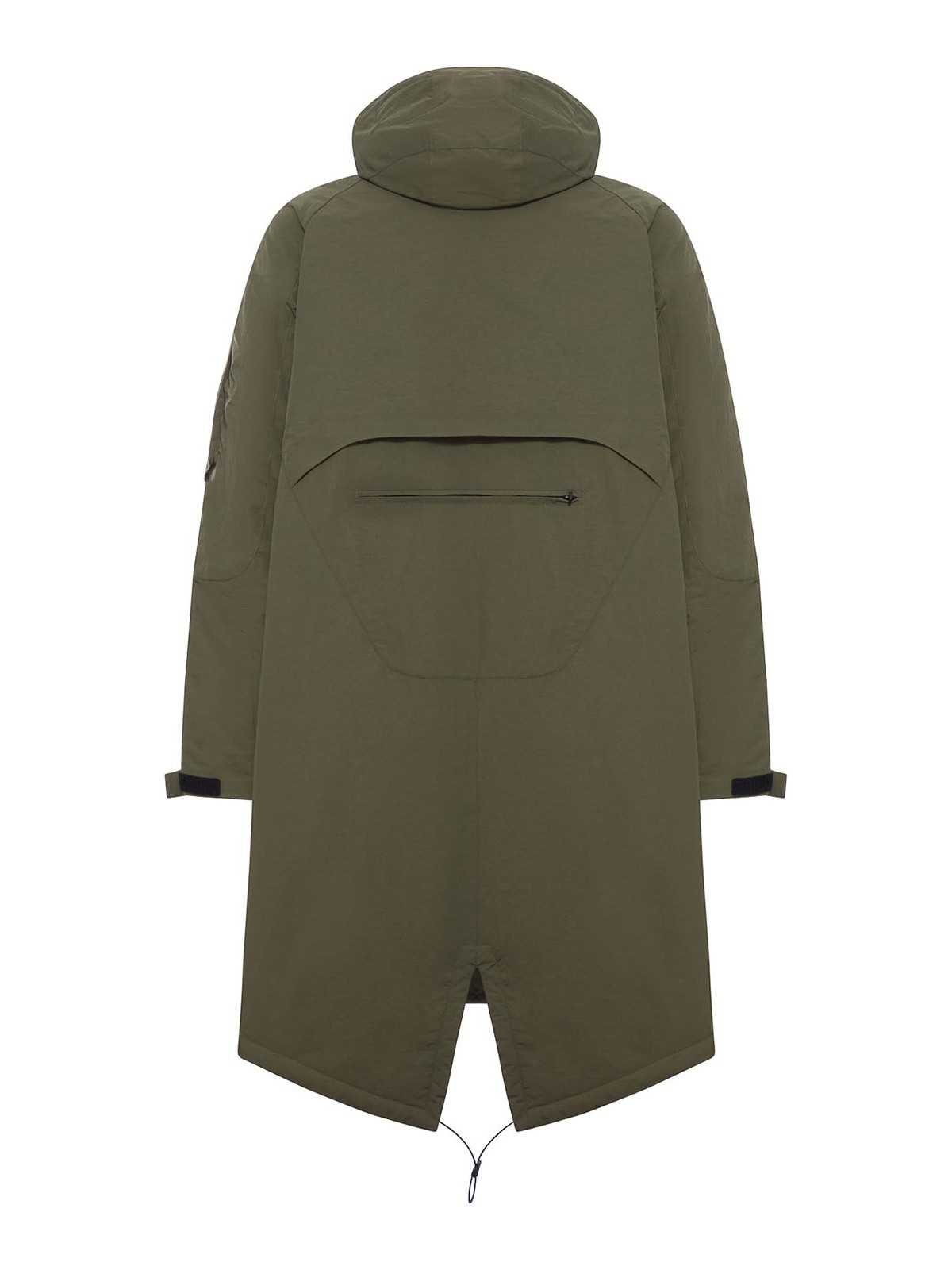 Cappuccio- zip coperta da patta con bottoni automatici- due tasche laterali al petto- tasca sinistra con zip, ampia tasca posteriore con zip orizzontale- polsini regolabili con linguette a strappo- fondo regolabile con coulisse elastica- spacco posteriore a coda di pesce- vestibilità  dritta- colore army