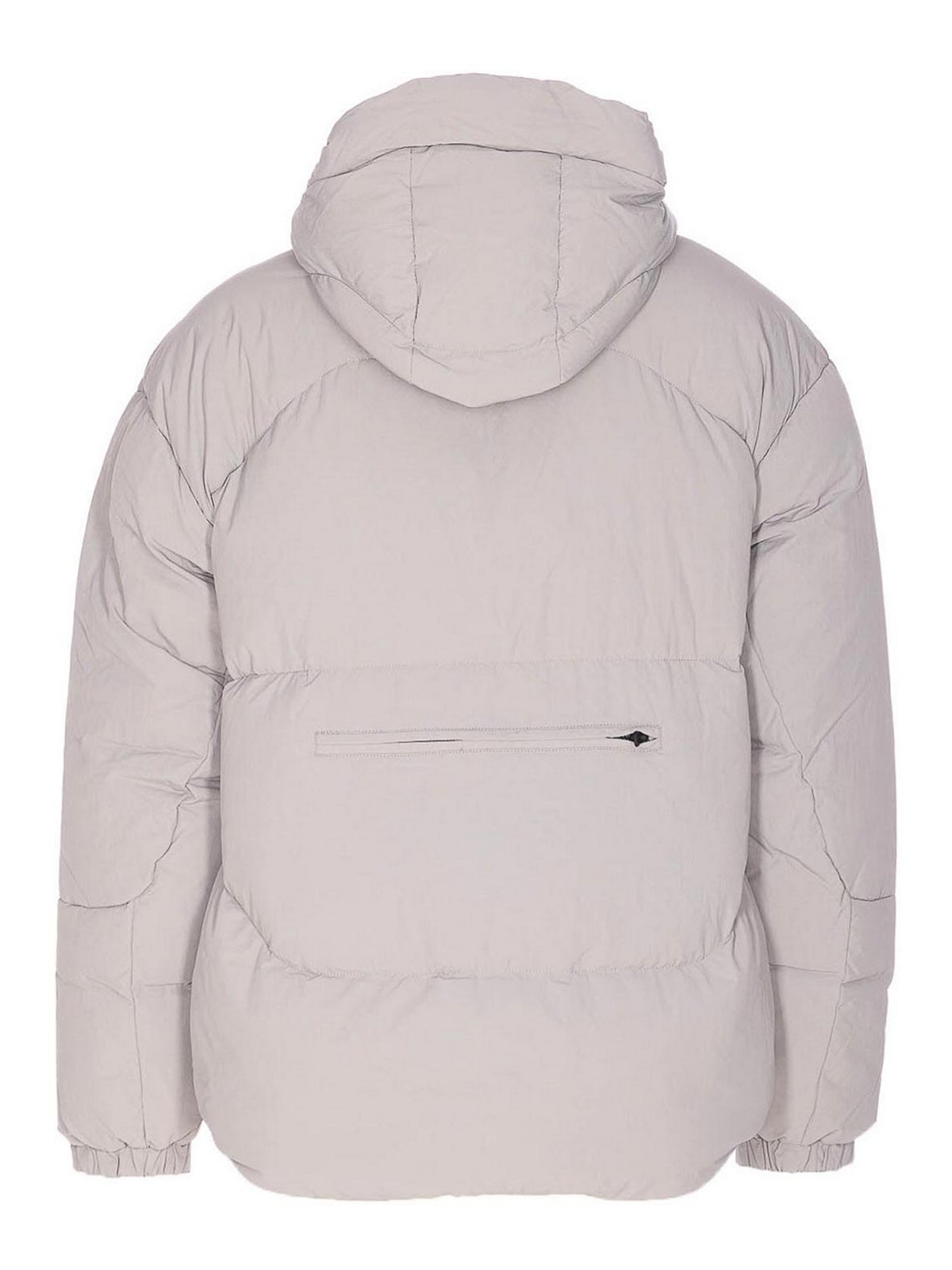 Piumino capospalla Jg1 grigio chiaro con chiusura frontale con zip e bottoni, dettaglio cappuccio con coulisse, maniche lunghe, maxi tasca con zip, imbottito
