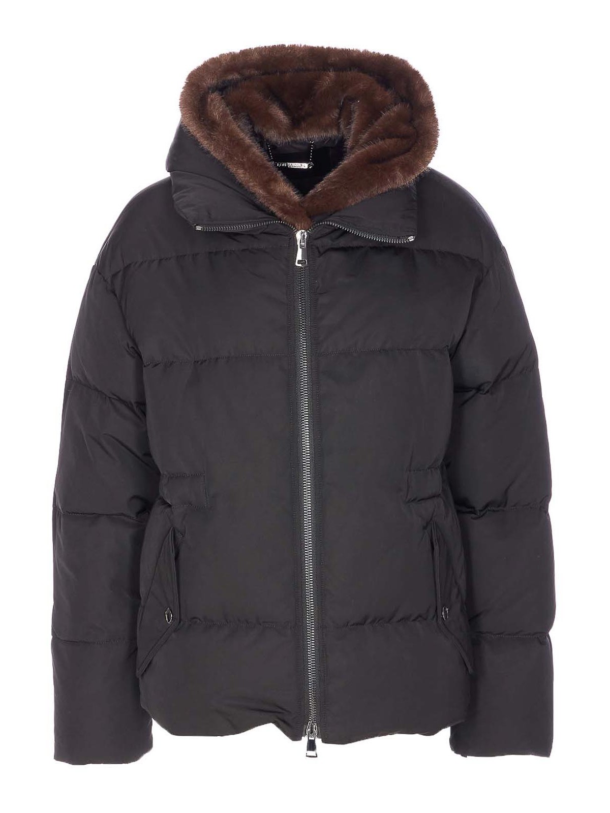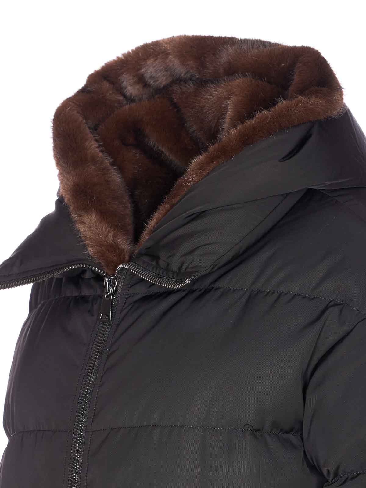 Lou andrea piumino nero con chiusura zip, dettaglio interno in ecopelliccia, maniche lunghe, tasche con chiusura a bottone, dettaglio cappuccio removibile, imbottito