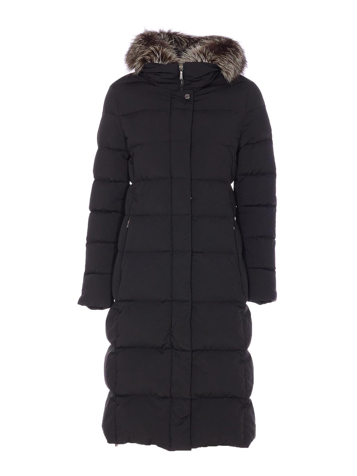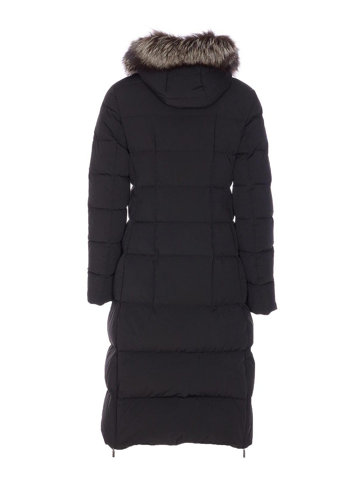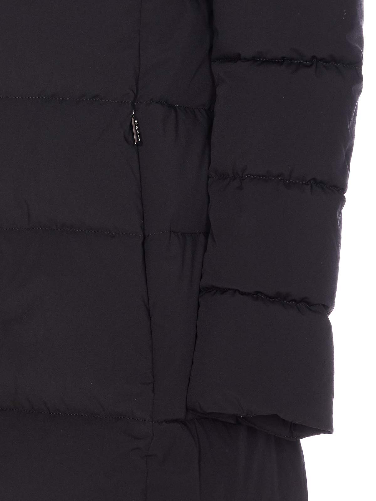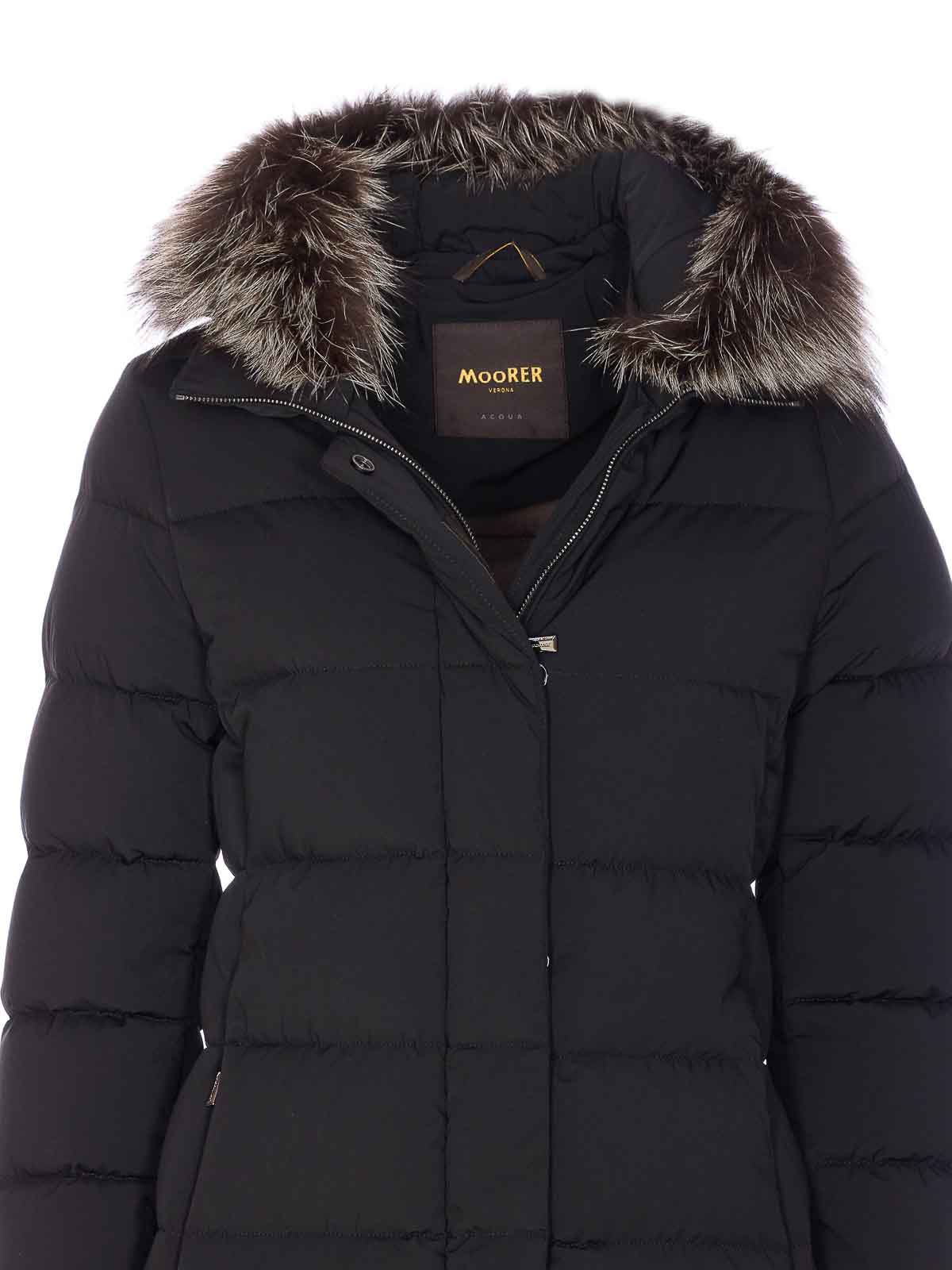 Piumino Moorer zagara nero con chiusura frontale con zip e bottoni, maniche lunghe, tasche con zip, dettaglio cappuccio removibile, dettaglio pelliccia removibile, dettaglio zip split, imbottito