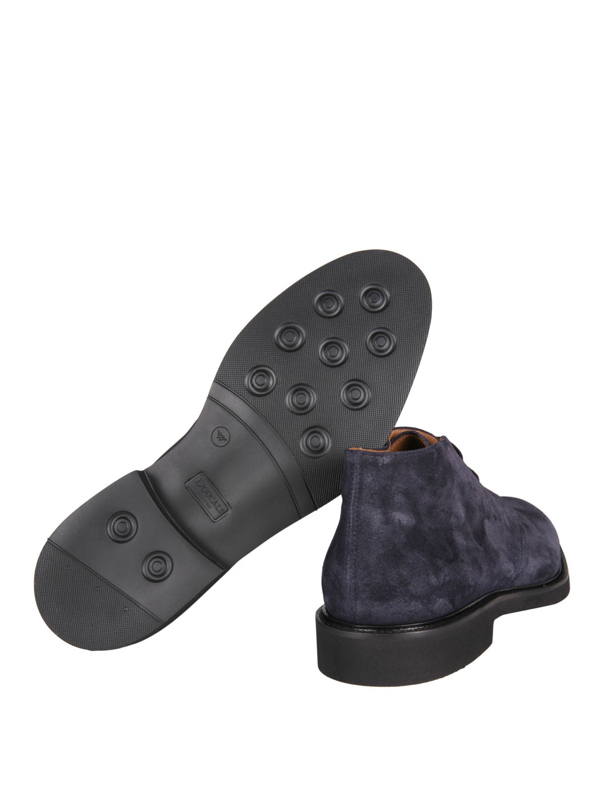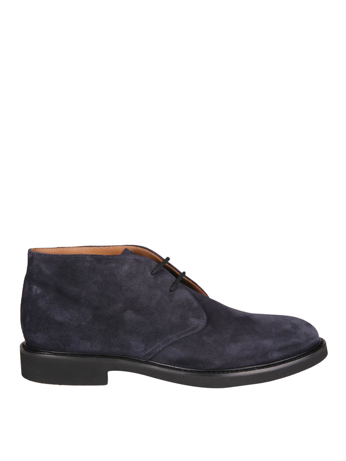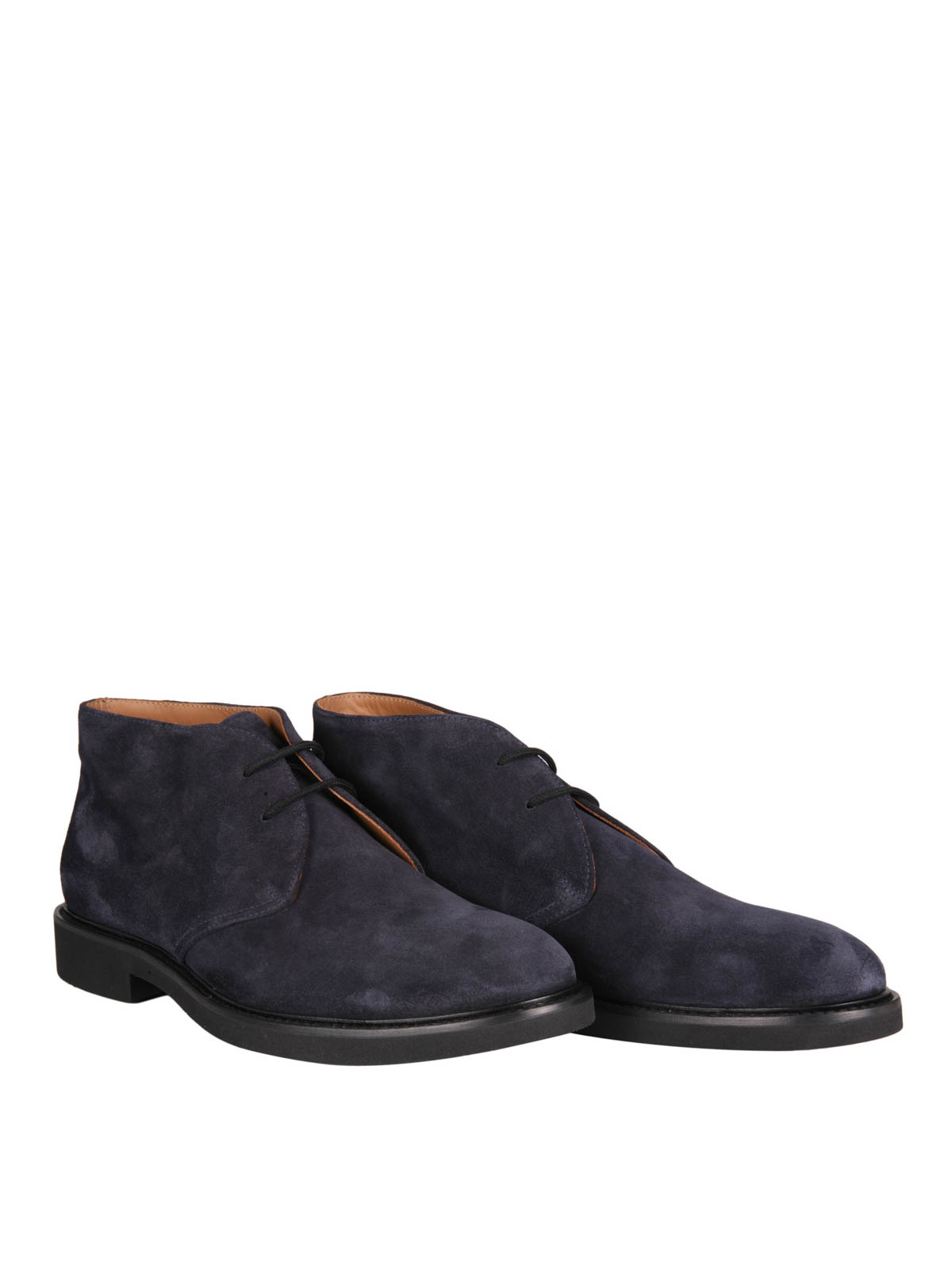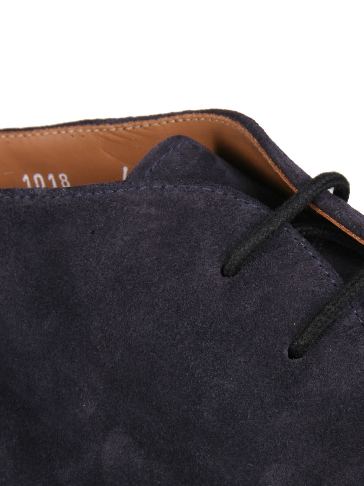 Polacchine in morbida pelle scamosciata con punta arrotondata, allacciate con due occhielli e stringhe in cotone cerato, suola e tacco in gomma.