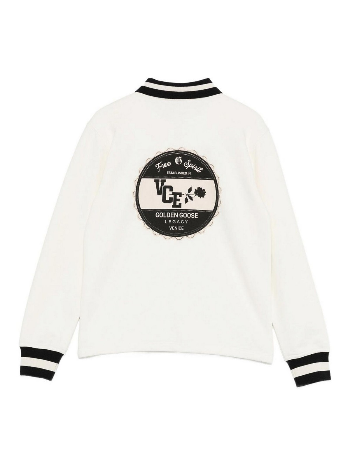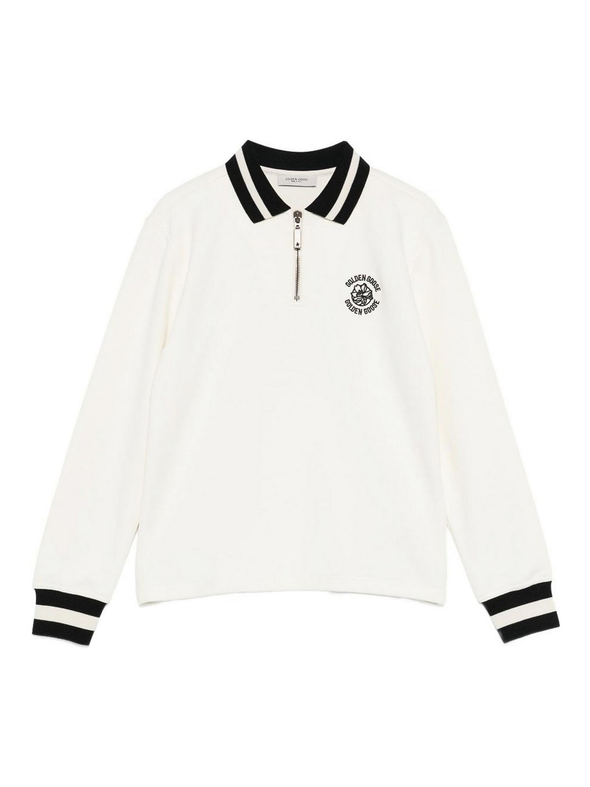 Polo con zip caratteristiche bianco maniche lunghe polsini a coste colletto e polsini a righe con mezza zip logo ricamato applicazione con logo sul retro