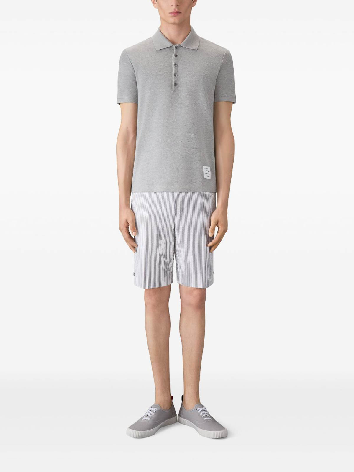 Design a pannelli in tessuto piqué grigio chiaro, colletto polo, maniche corte, etichetta con logo a righe, linguetta ad anello in gros grain, orlo dritto, bottone corto