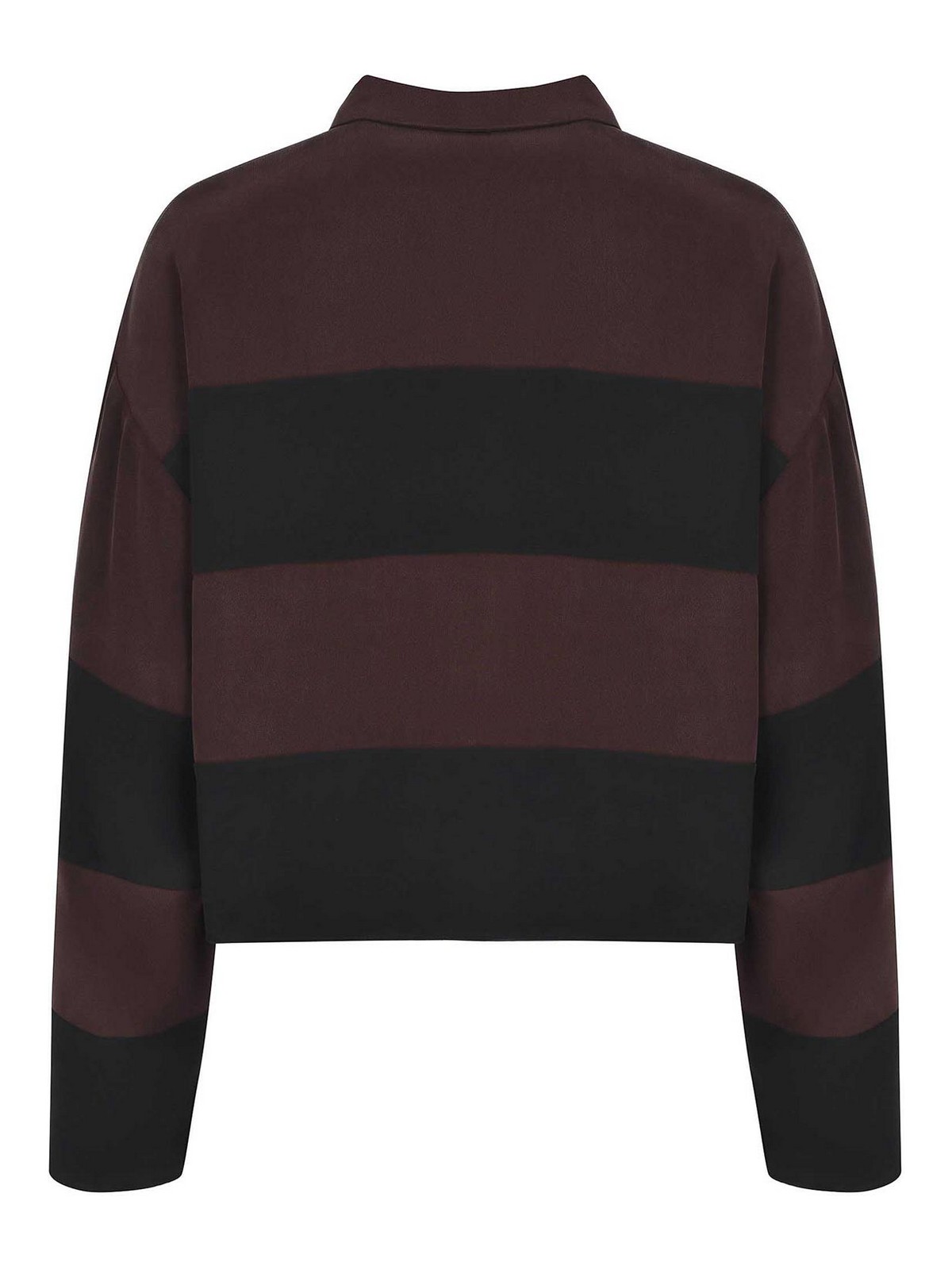 Polo Alysi in seta marrone/nera, fantasia a righe, colletto classico, bottoni sul petto, maniche lunghe, 100% seta made in Italy