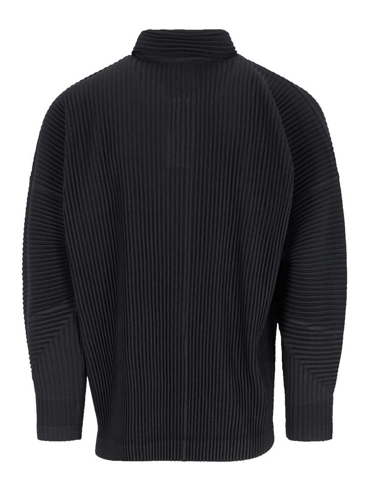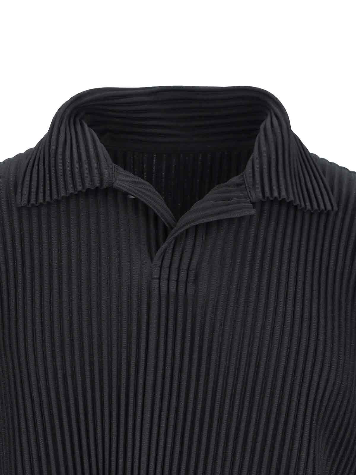 Polo plissettata homme plisse, in tessuto nero, colletto classico, chiusura bottone, orlo dritto.