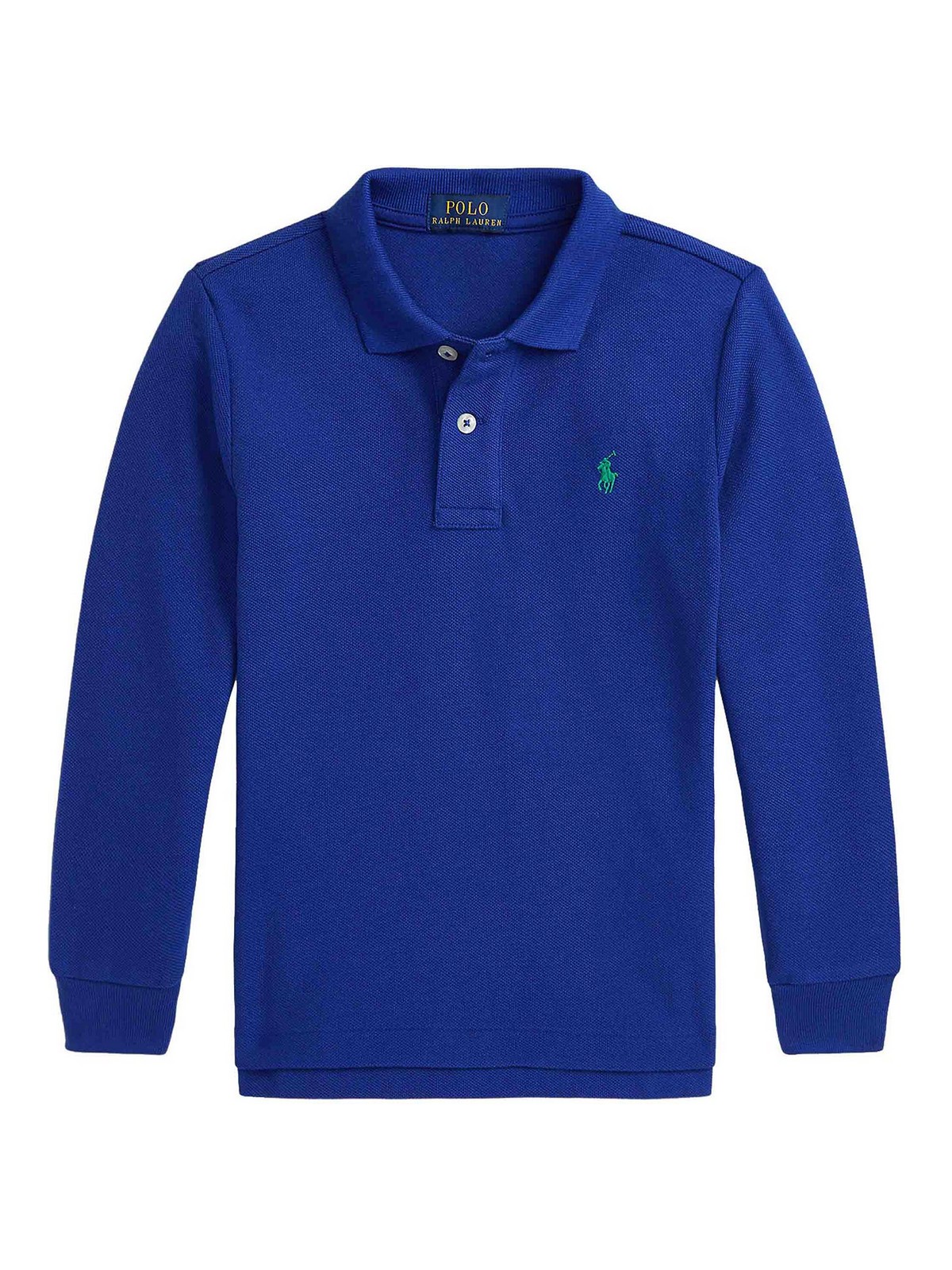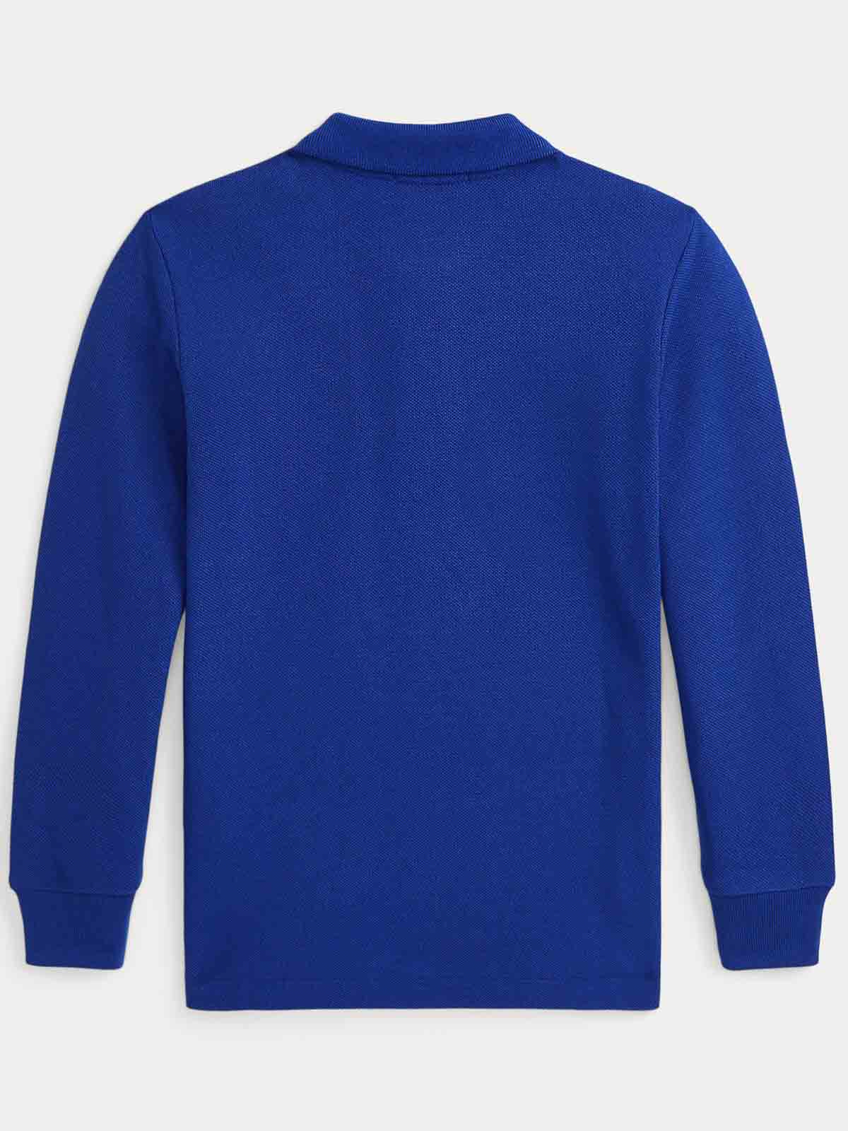 Piqu di cotone blu con abbottonatura frontale, collo polo, logo ricamato sul petto, maniche lunghe, polsini a costine e orlo dritto.