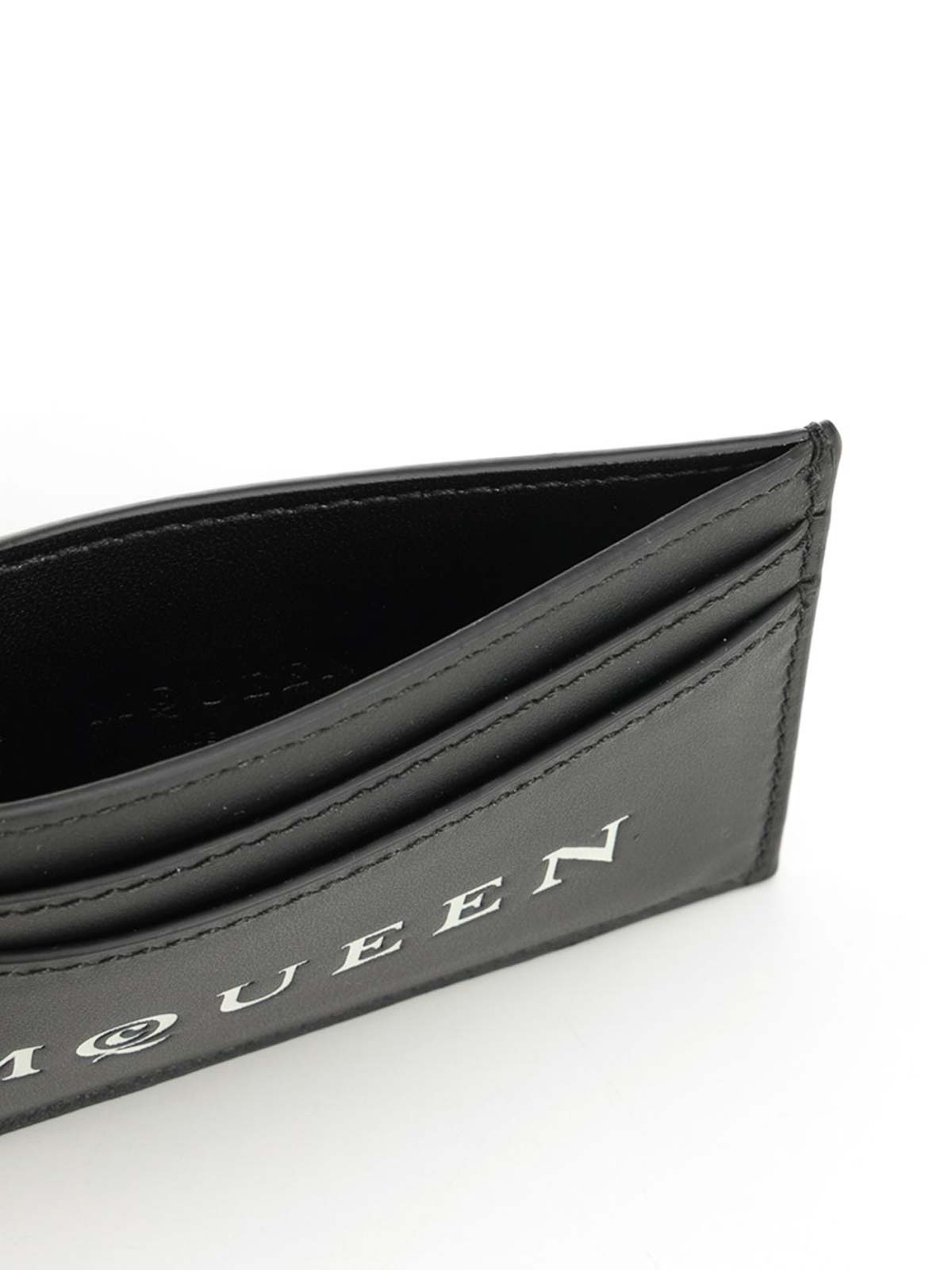 McQueen Card Holder in Soft Black Calfskin di McQueen, con un compartimento centrale e slot a quattro carte, logo McQueen ad alta frequenza stampata sul davanti.