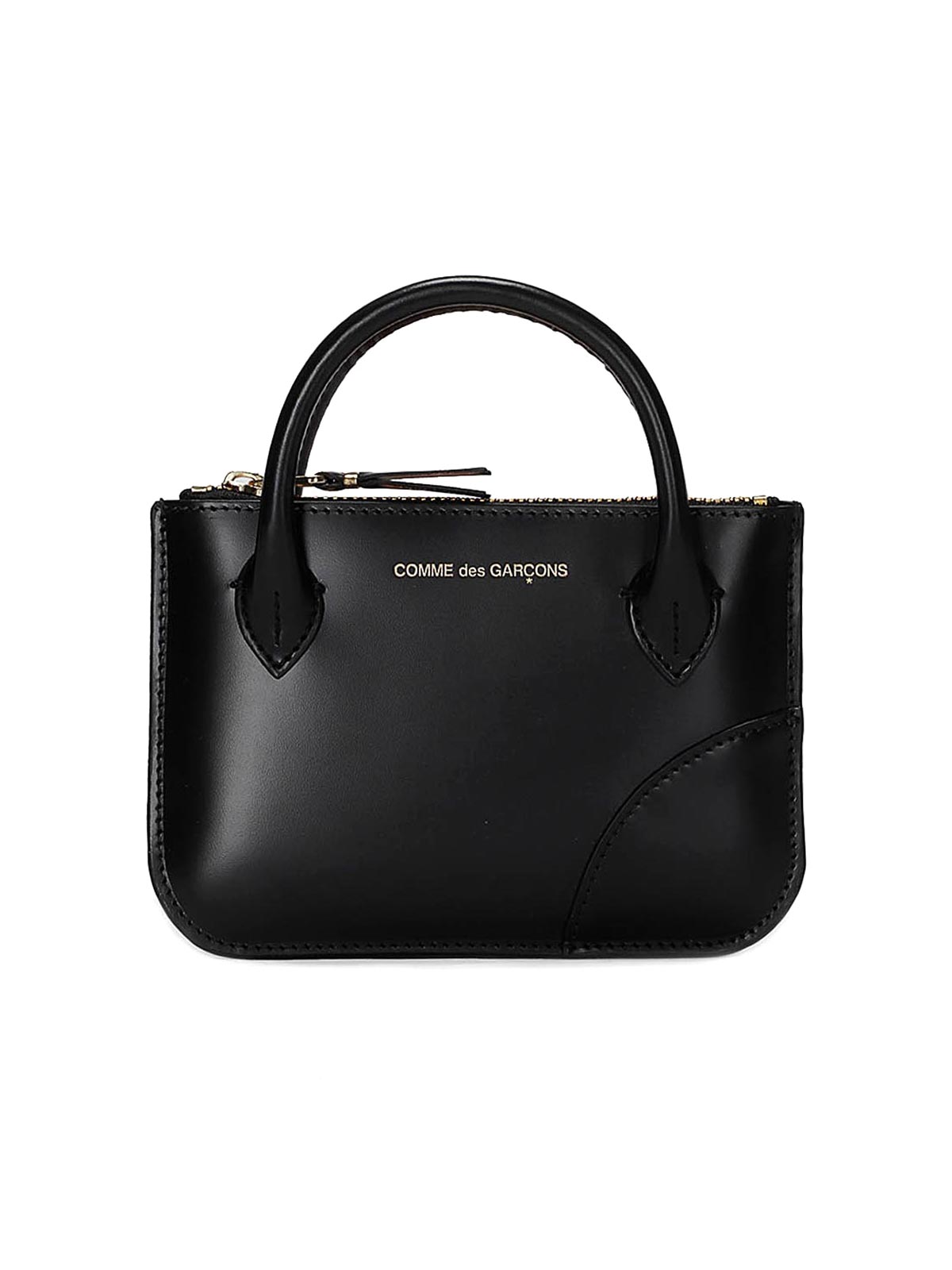 Portafoglio in pelle di colore nero, chiusura con zip, logo stampato sul davanti, due manici, scomparto interno.
