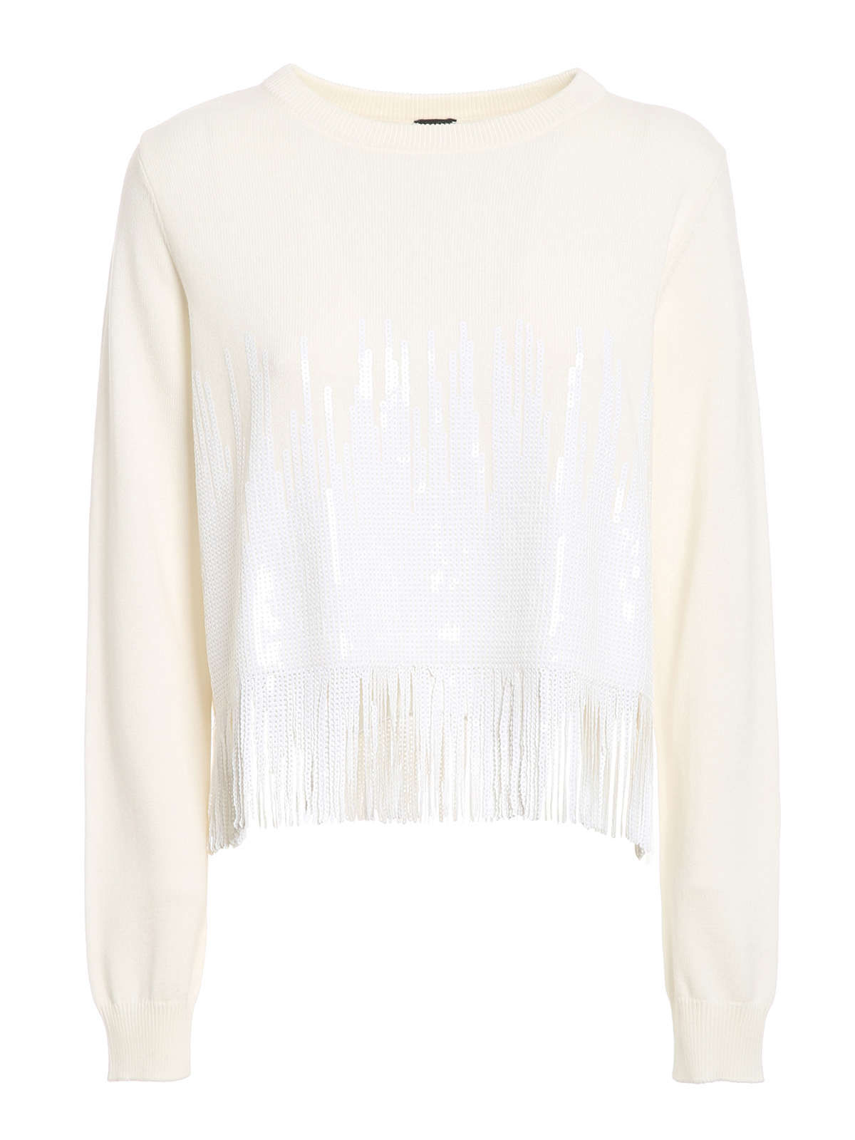 Pull in punto rasato di cotone con polsini elasticizzati e fondo sfrangiato tempestato paillettes.