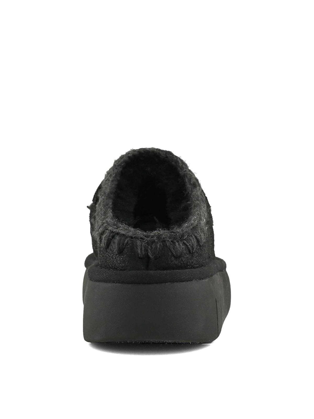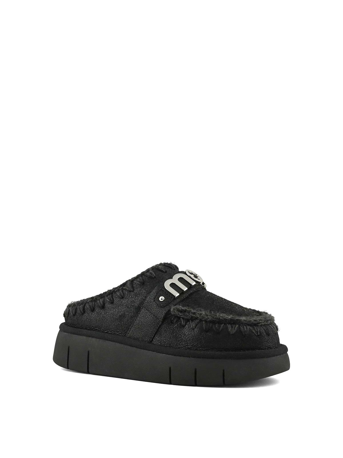 Eskimo slipper donna nero con logo in metallo realizzato artigianalmente in vera di montone double, face con le inconfondibili cuciture all'uncinetto