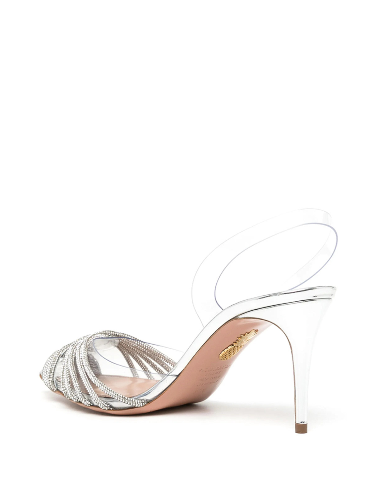 Cinturino slingback in pvc/pelle trasparente/tono argento abbellimento con cristalli e tacco a spillo a punta