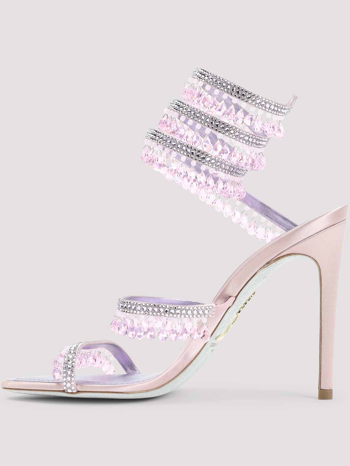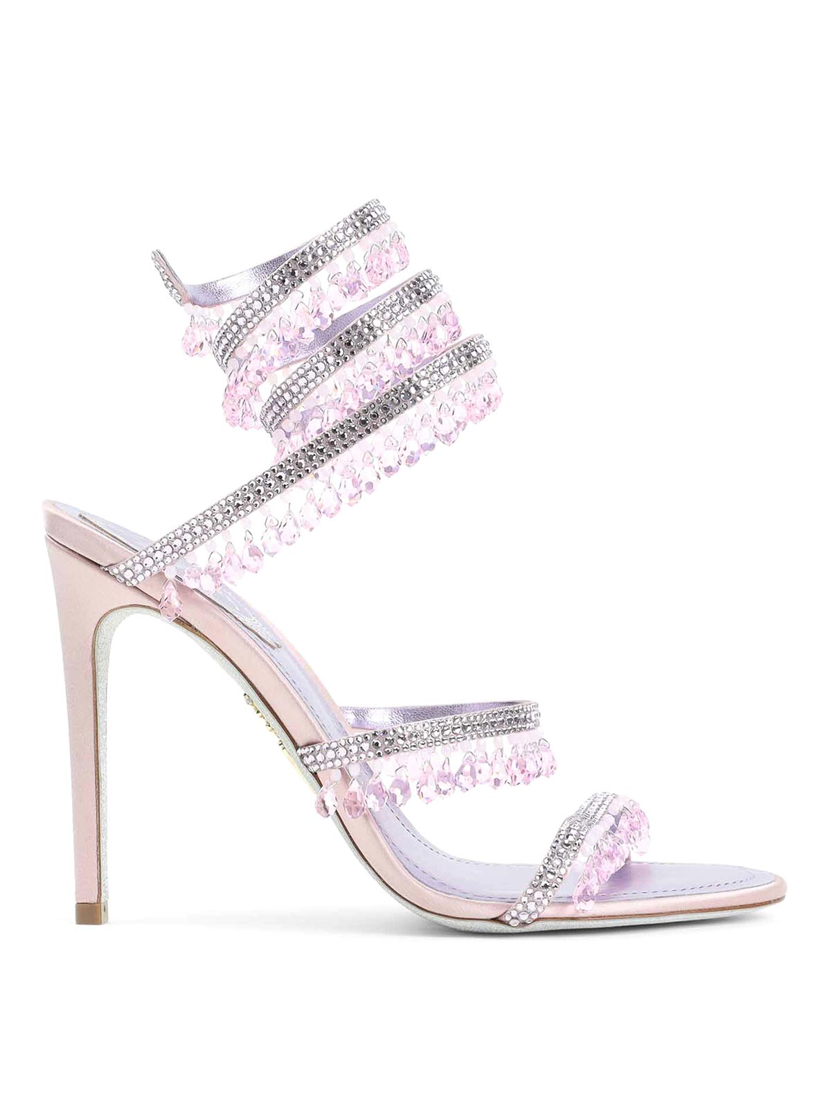 Sandali Rene Caovilla in pelle chandelier satin lilla. tomaia in raso e pelle con caratteristico abbellimento di cristalli. strass applicati a mano. tacco alto, suola e sottopiede in cuoio.