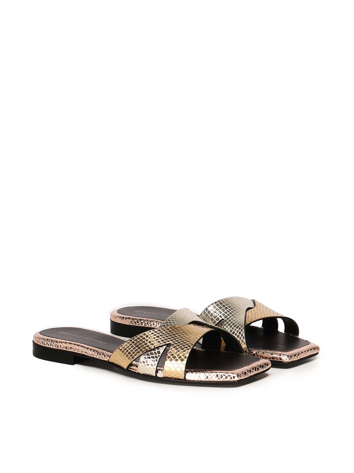 Sandali piatti, punta aperta quadrata, realizzati in Italia, platino a colori