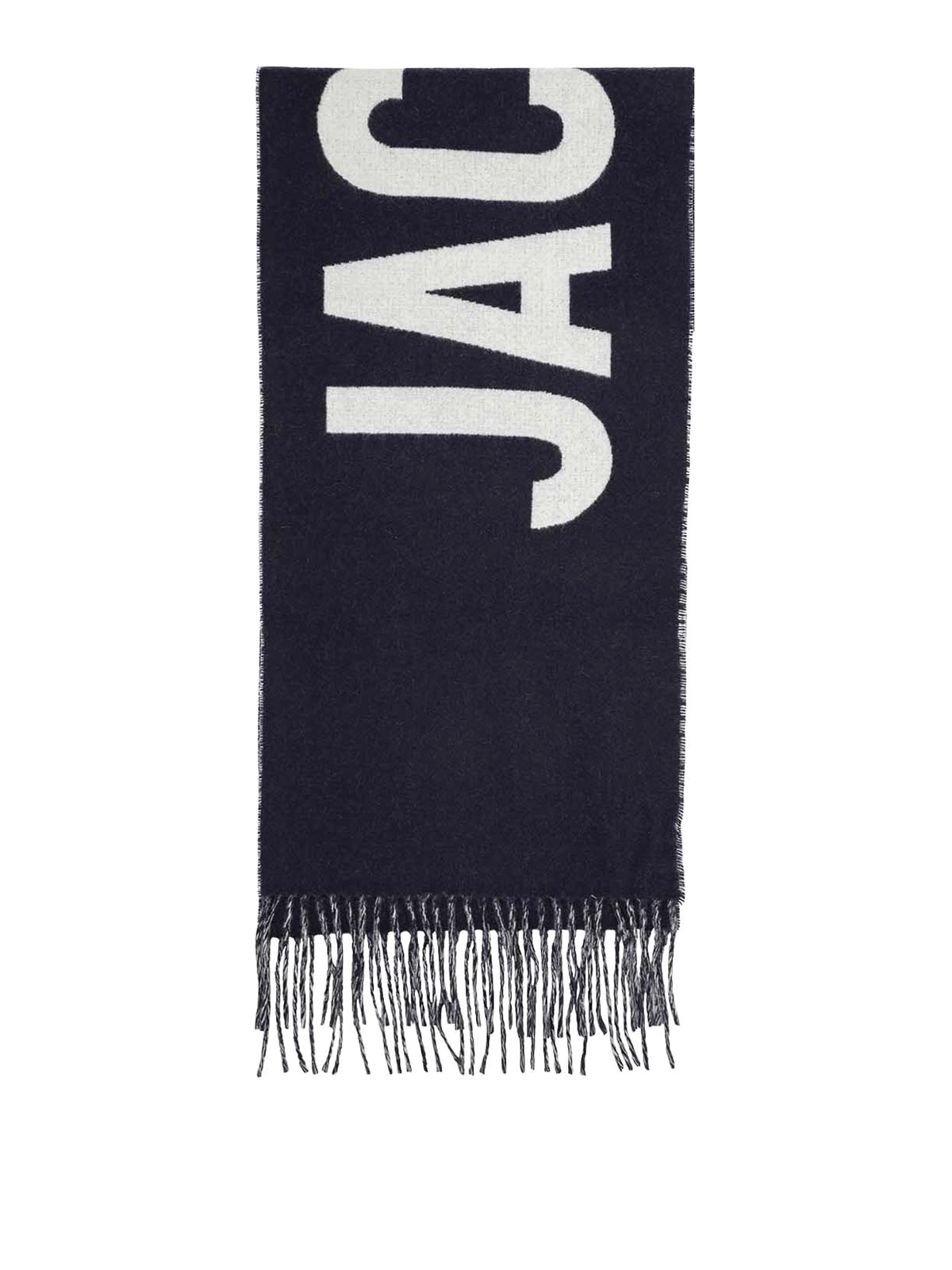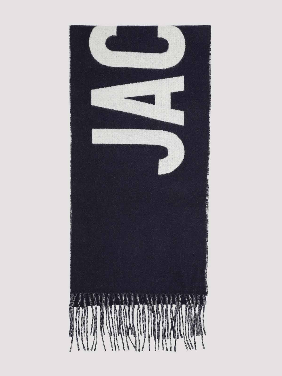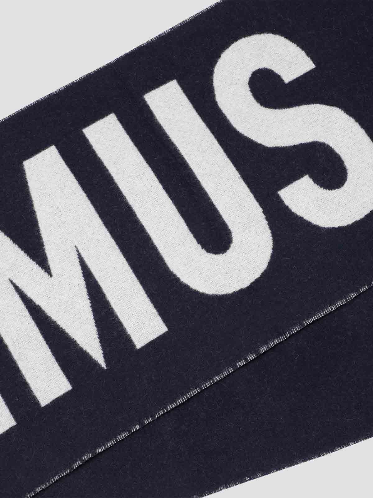 Jacquemus Navy Logo L'Echarpe Jacquemus Navy Contrasta il logo bianco Lettering bordi bordi