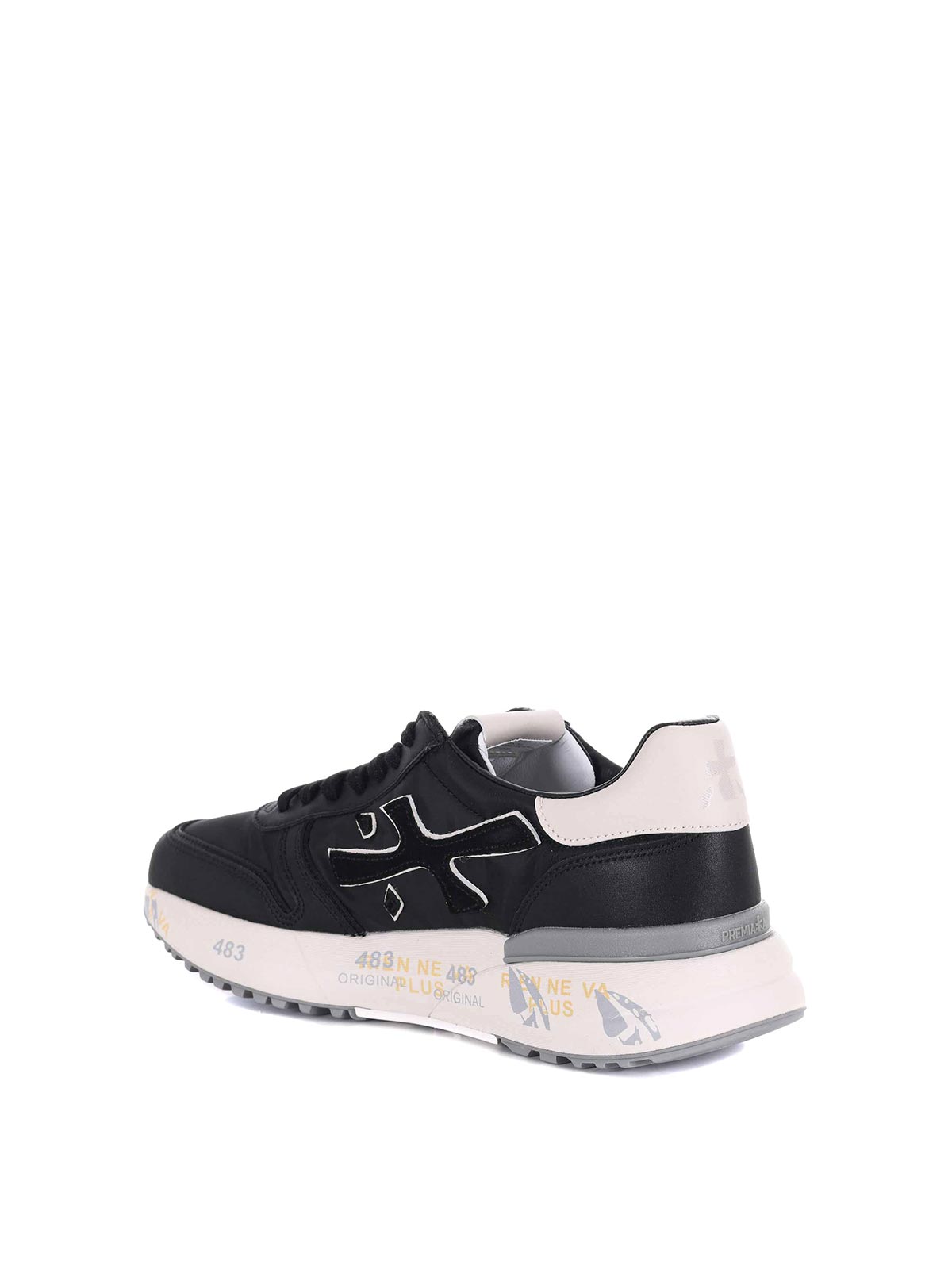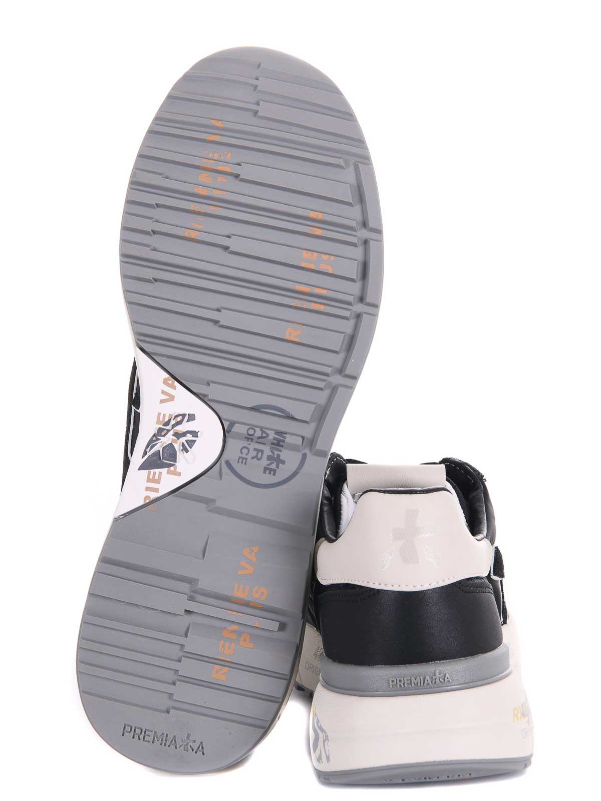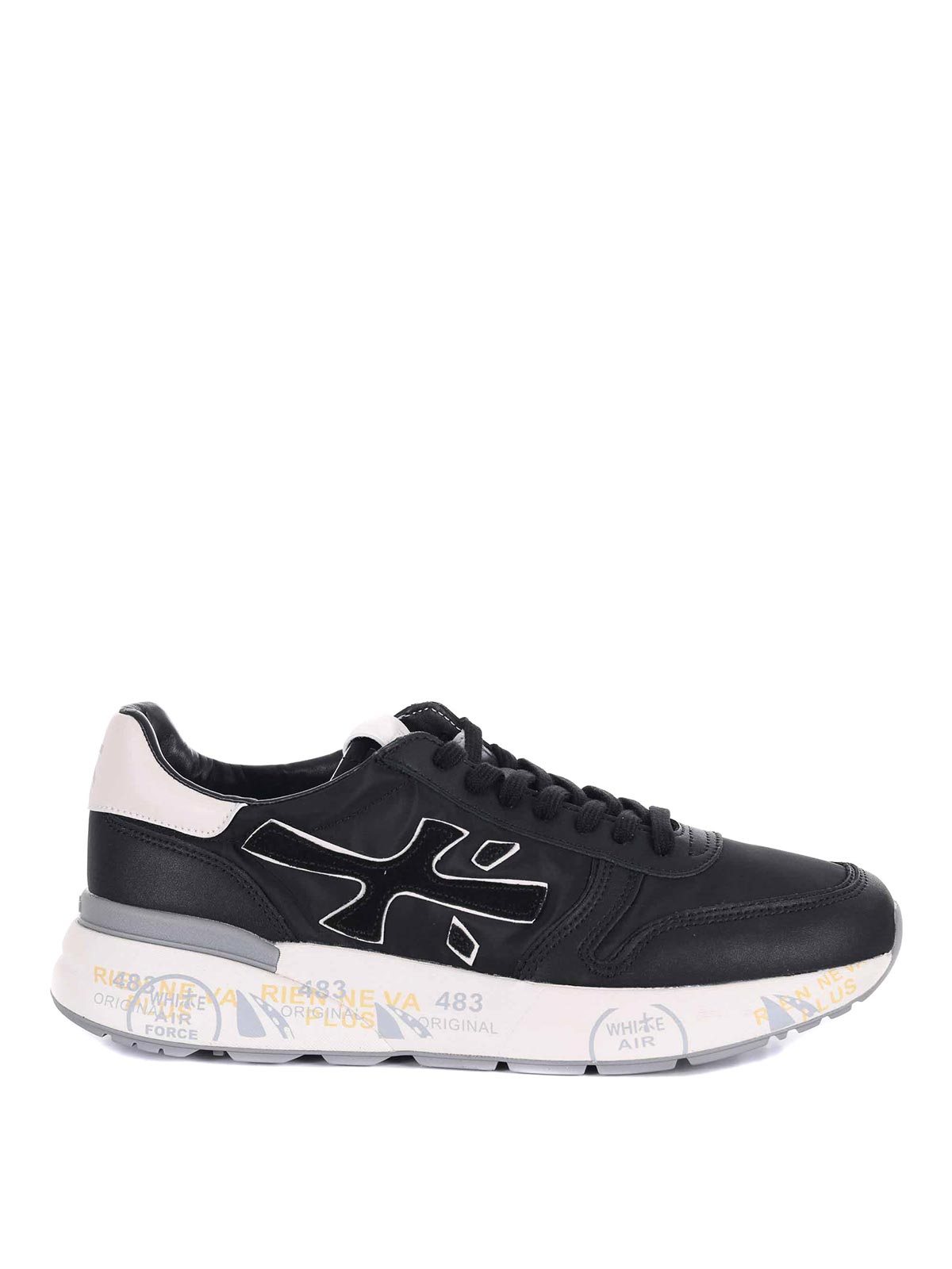 Sneakers Premiata in pelle e nylon nere. inserti a contrasto. logo laterale. allacciatura. Suola in gomma stampata da 45 mm. taglia mostrata: 40