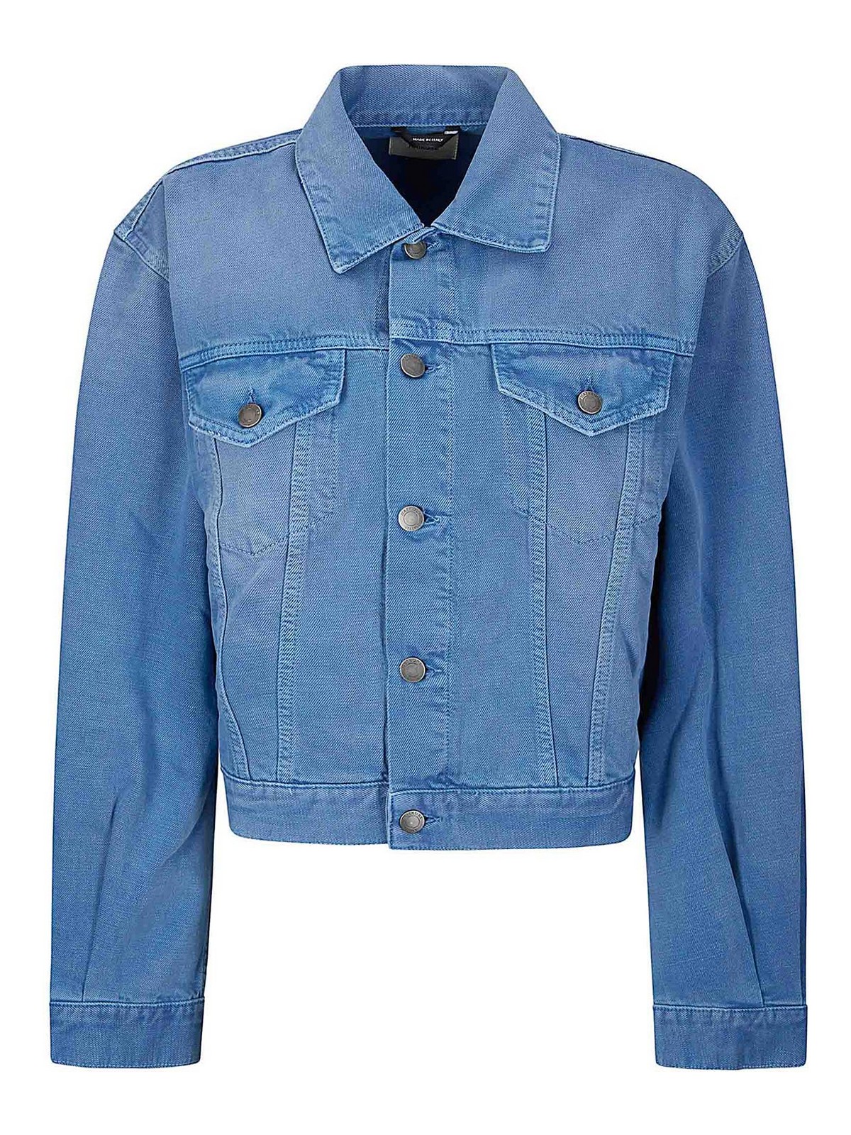 Giacca corta in cotone effetto denim, lavaggio medio chiaro, bottoni a contrasto.