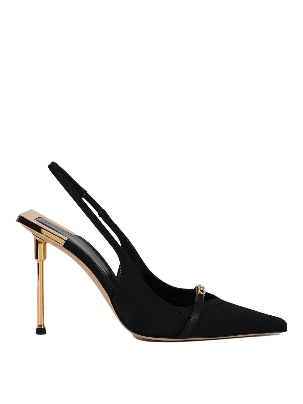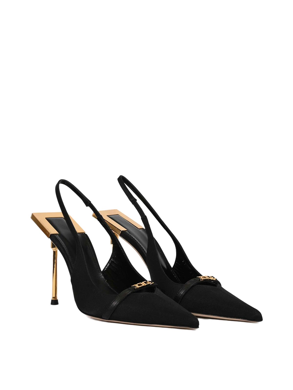 Slingback da donna in satin, elisabetta franchi, modello con tacco scultura., tomaia: realizzata in satin di misto cotone con punta affusolata., chiusura: cinturino slingback con elastico posteriore., suola: in cuoio., fodera: in pelle., dettagli: fascia frontale con logo in metallo dorato., tacco: stiletto scultura in metallo dorato.