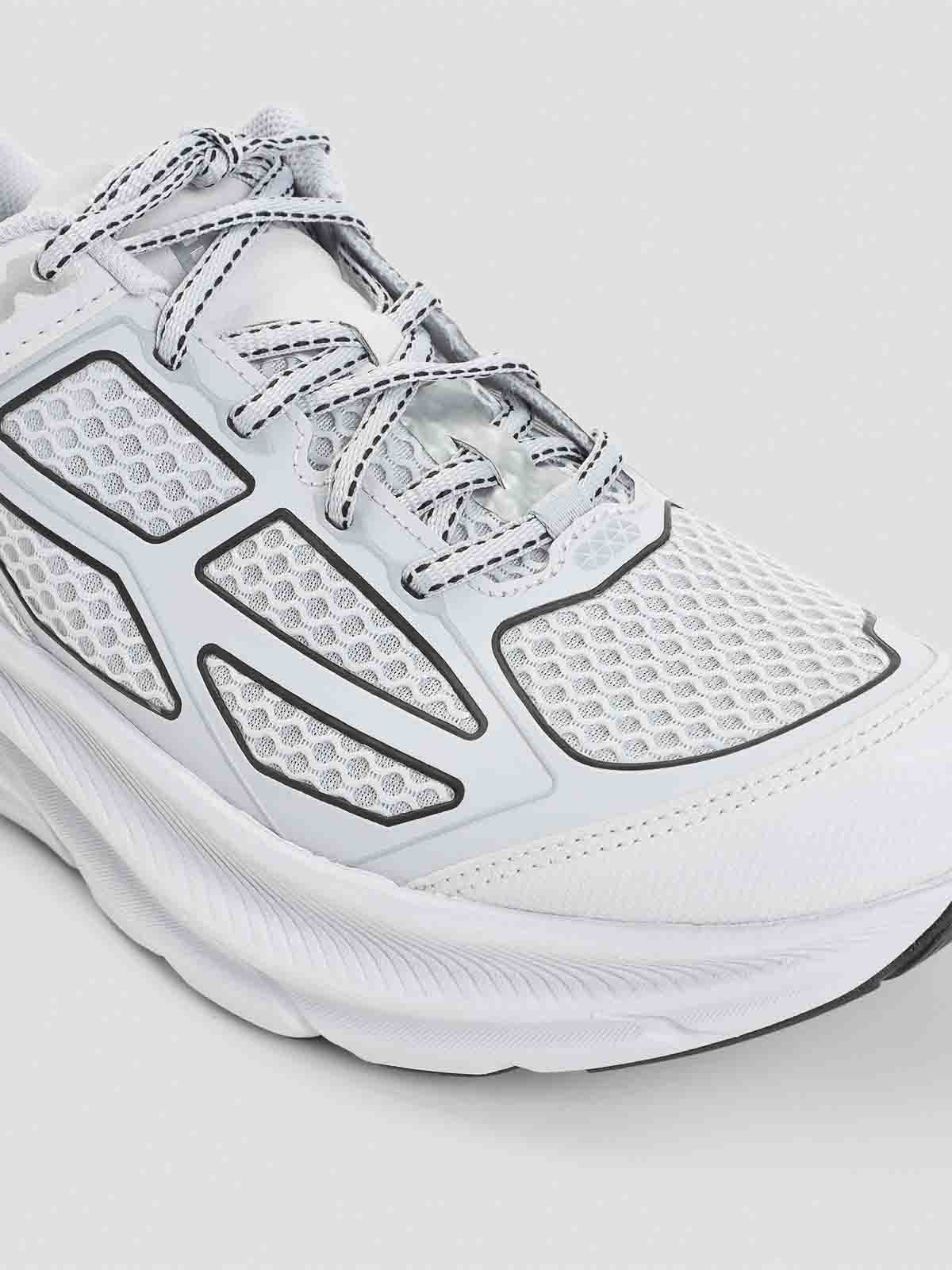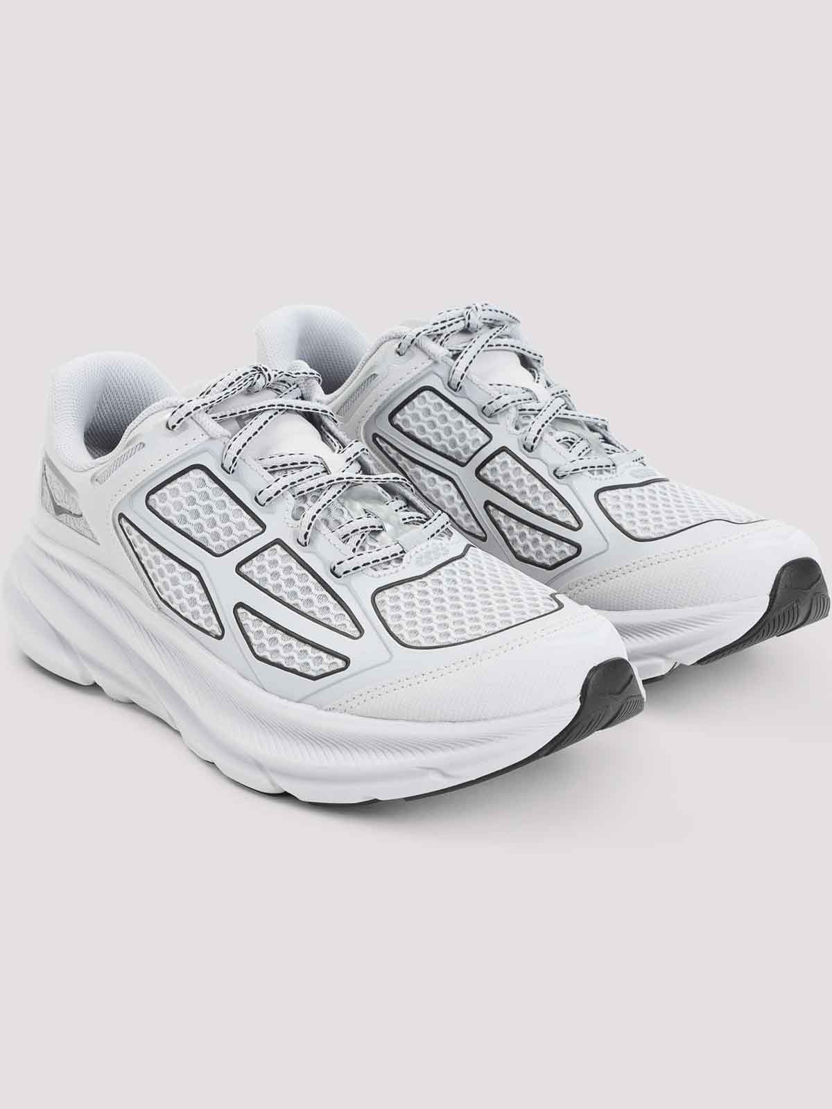 Hoka grigio clifton one sneaker cenere grigia e apertura, mesh foro sottofongo tpu pellicola sovrapposizione a strati retrò logo hoka tappo di punta sintetico e pizzo secondario con il contatore incluso il dimensionamento delle calza