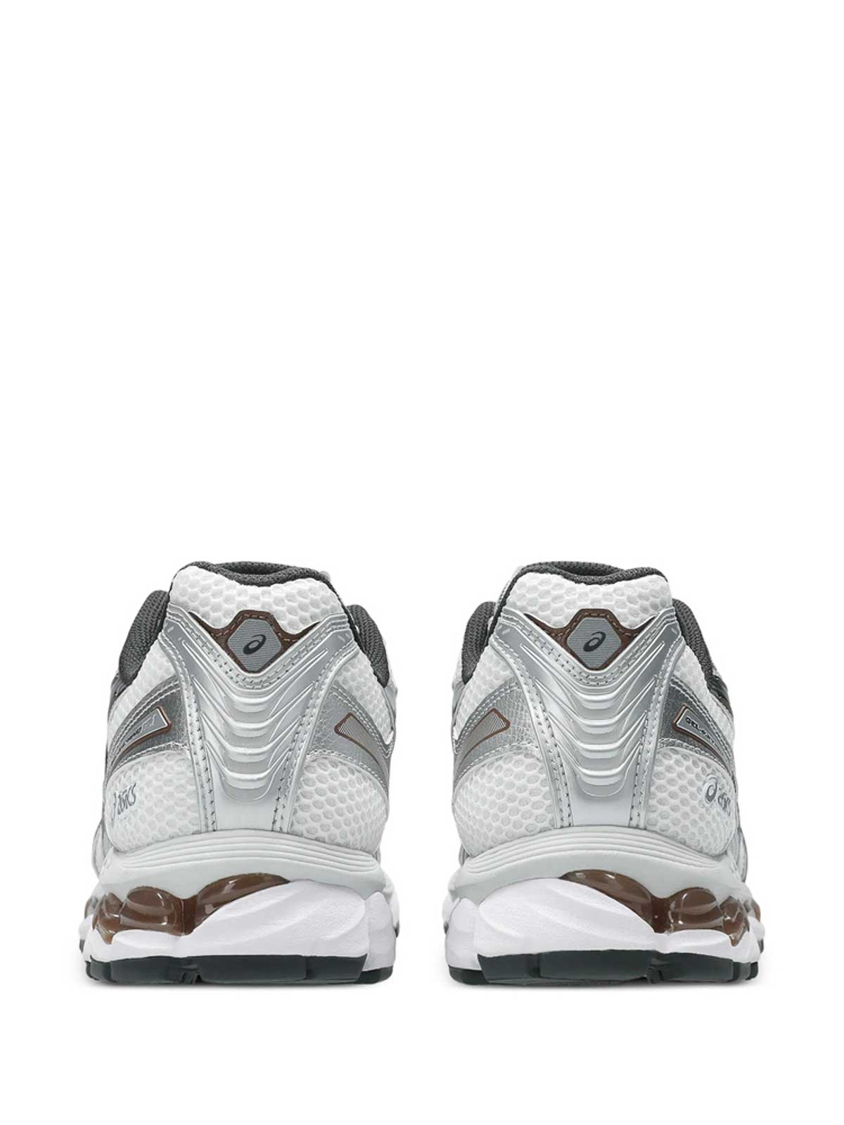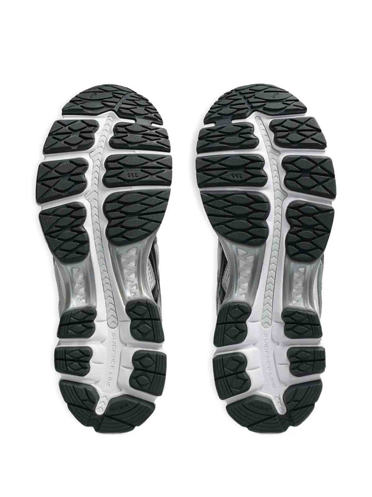 Dettaglio logo suola in gomma con pannelli in mesh e chiusura con lacci bianca/grigia