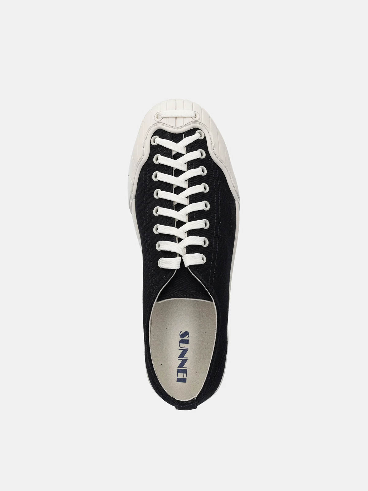 Tu isi in nero. sneaker in tessuto di sunnei con puntale in gomma riforzatocon design ondulato. stringata, suola con logo tono su tono sul retro, puntale rinforzato con design ondulato.