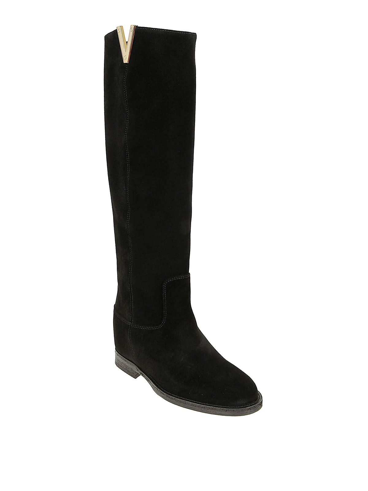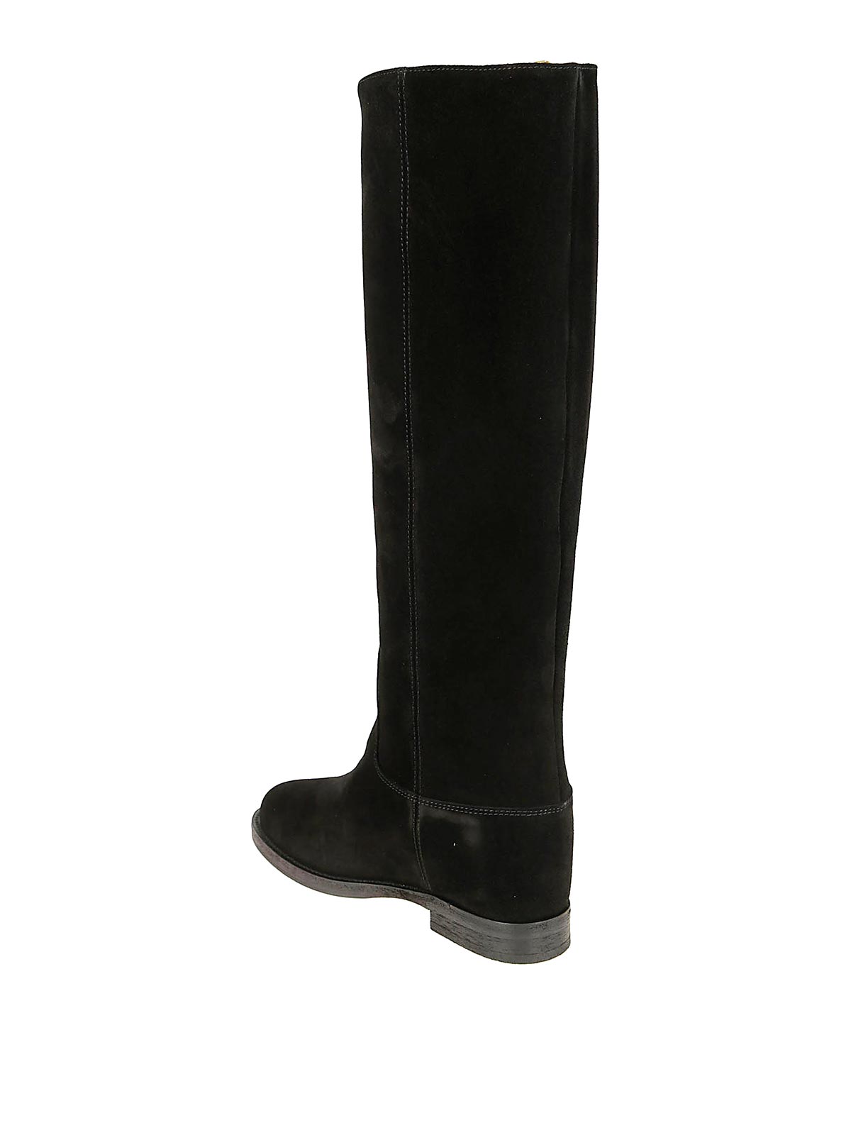 Stivale in camoscio nero via roma a tubo, all`interno zeppa rialzo di 6/7 cm