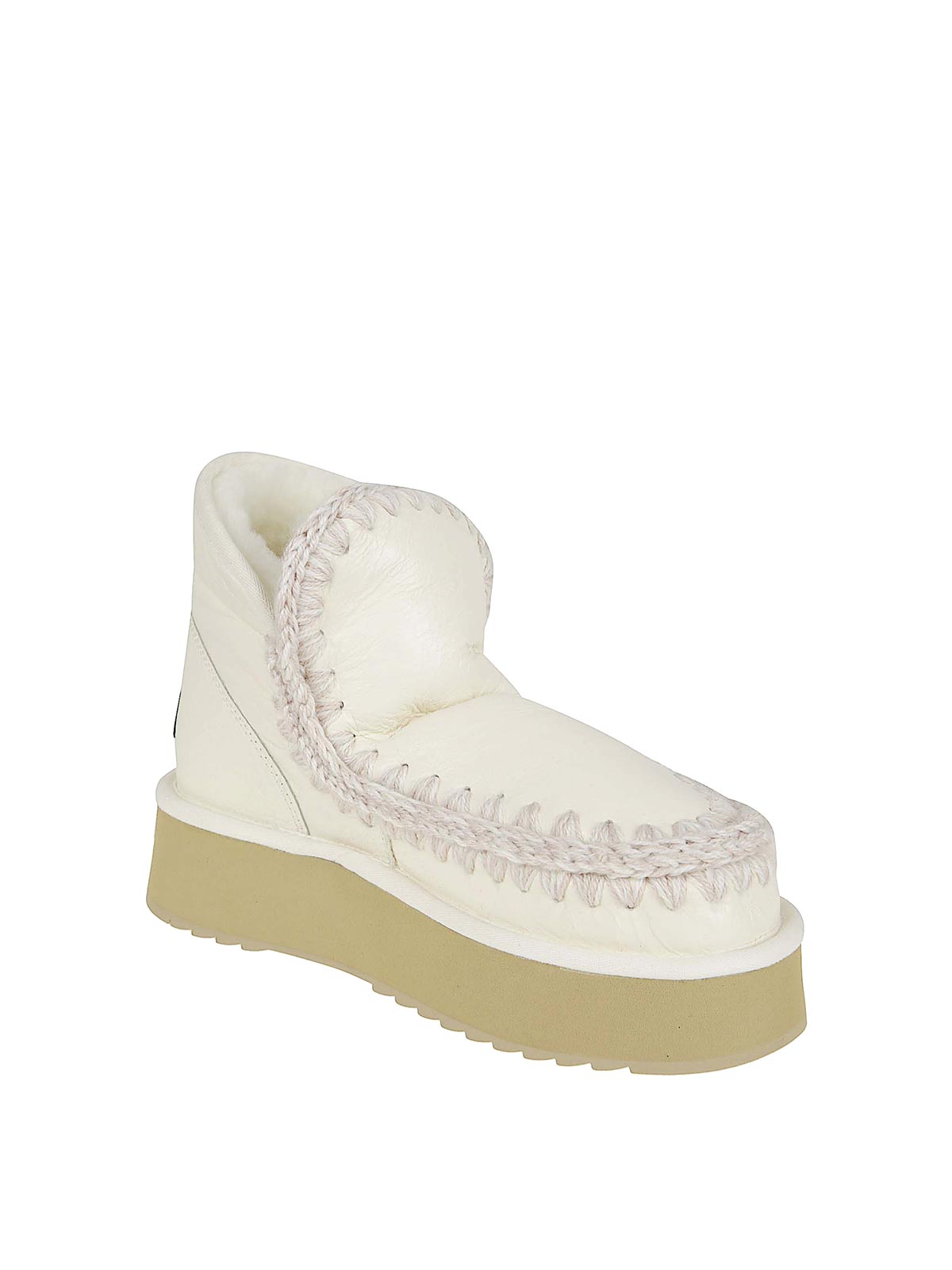 Stivale mini eskimo platform di mou, realizzati in pelle di ovina scamosciata con impunture a vista realizzate a mano, caratterizzato da suola flatform da 50 mm, toppa con logo sul retro, punta tonda fodera in montone suola in gomma.