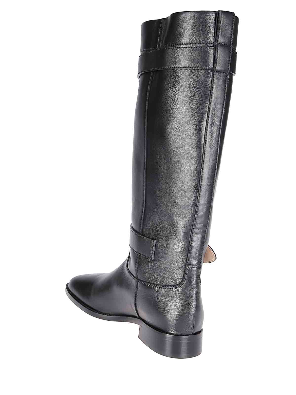 Stivali alti in pelle con tacco basso, dettagli con zip e fibbie, stile cavallerizza.