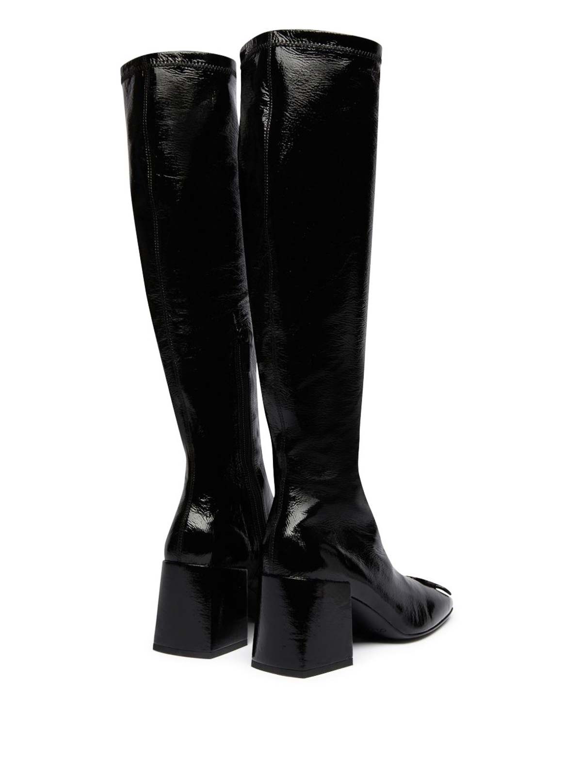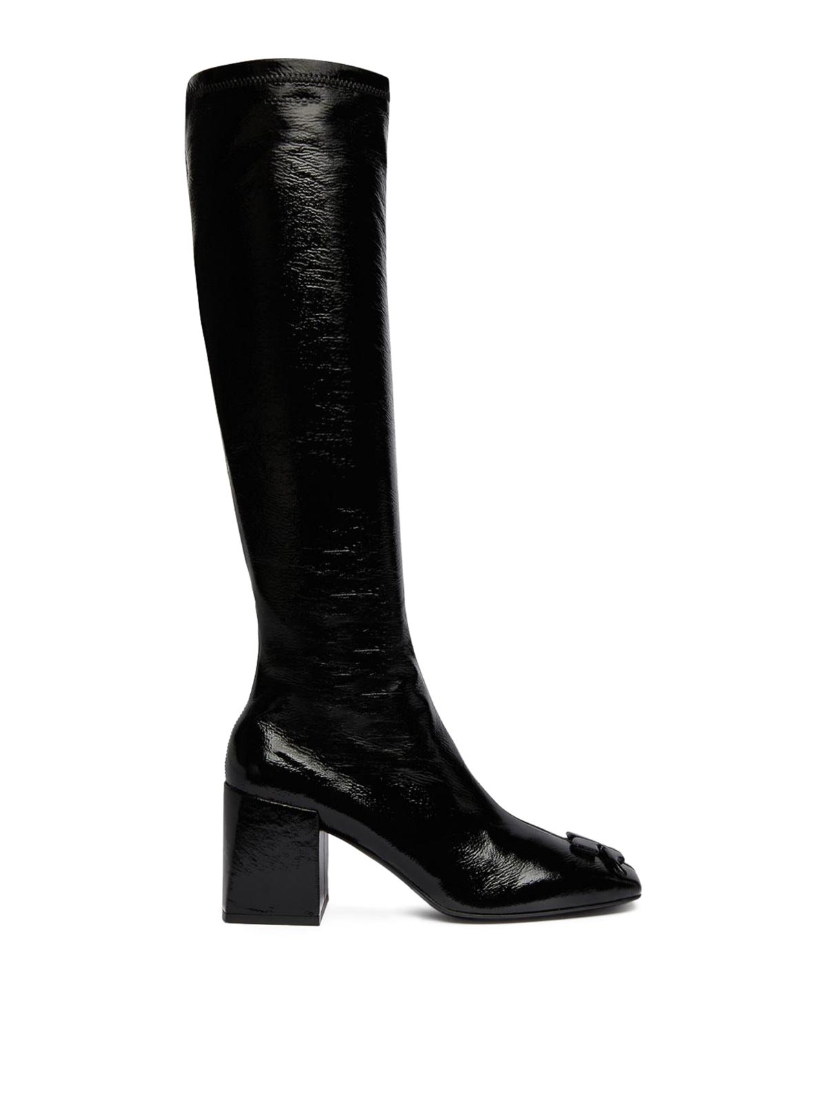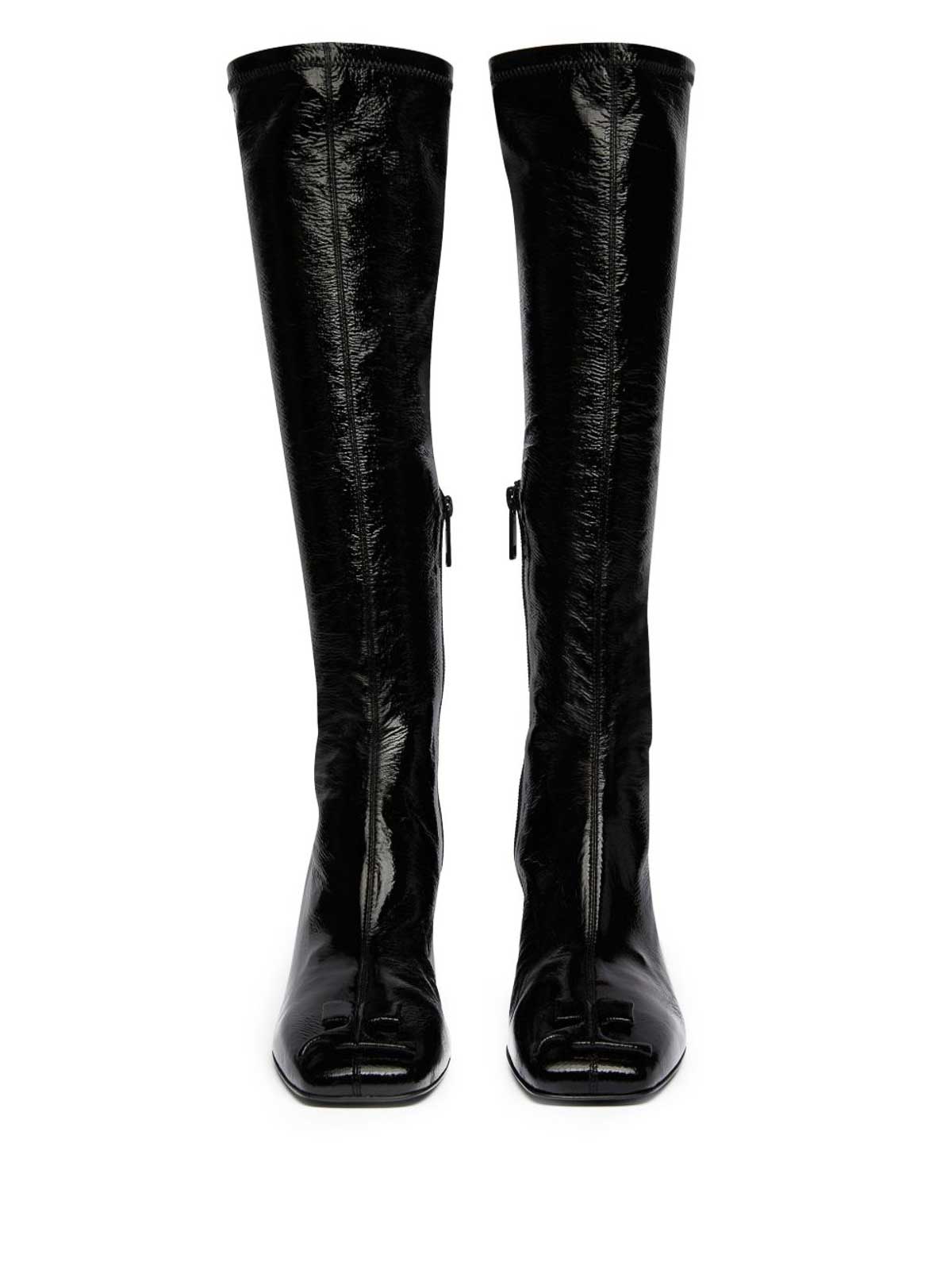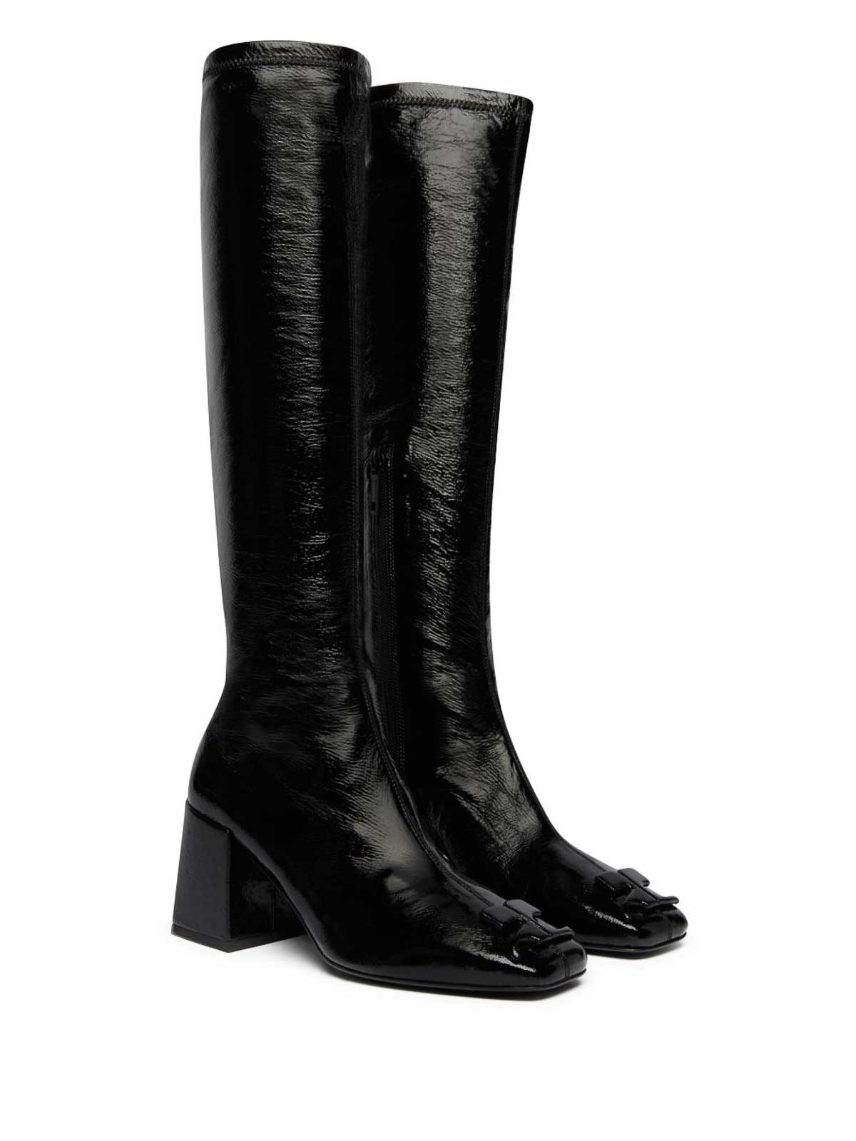 Nero finitura lucida placca con logo tono su tono design pull on altezza ginocchio laterale con zip corta punta quadrata e largo origine italia