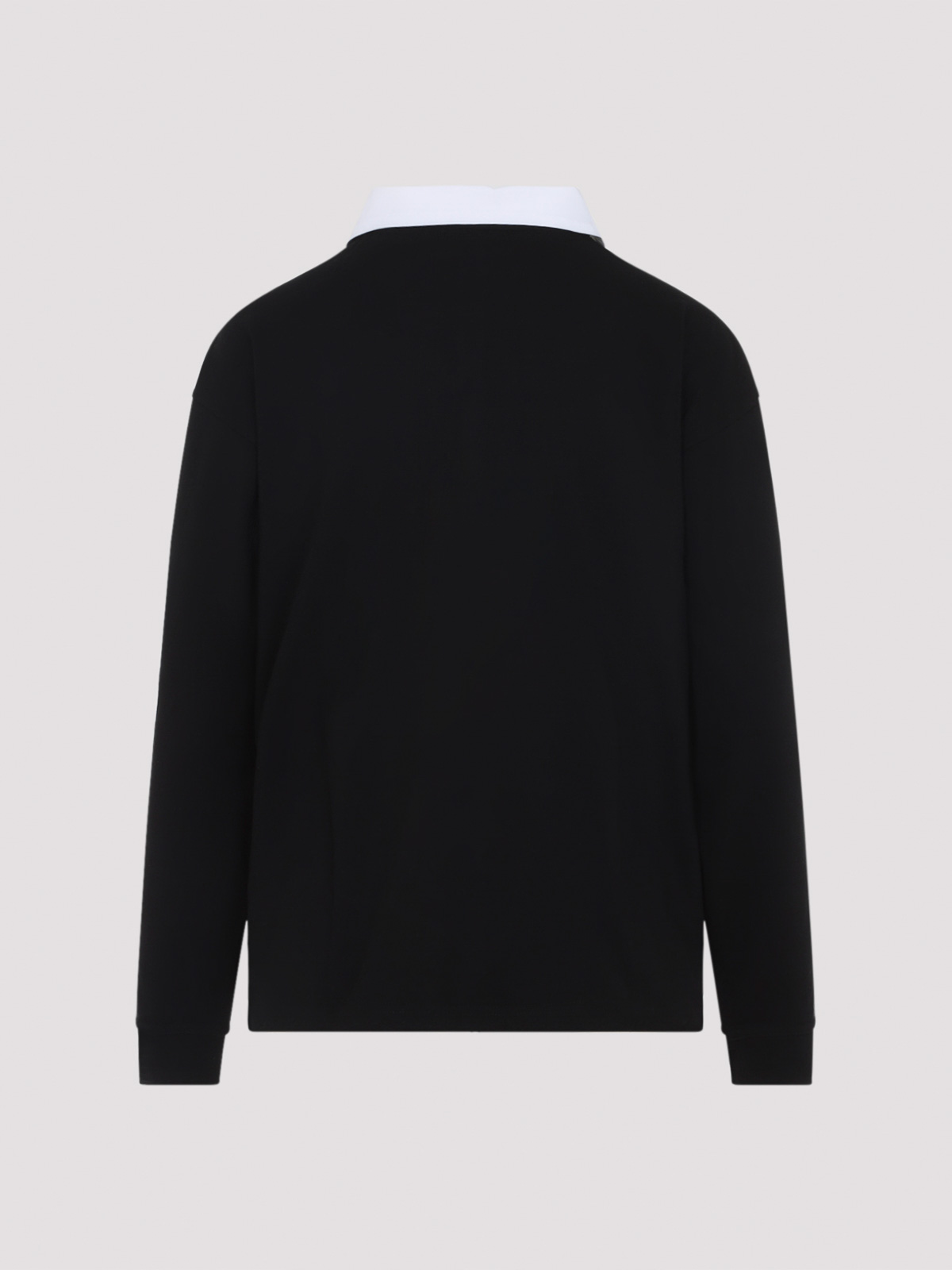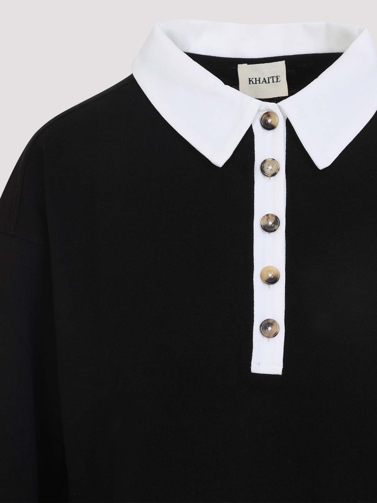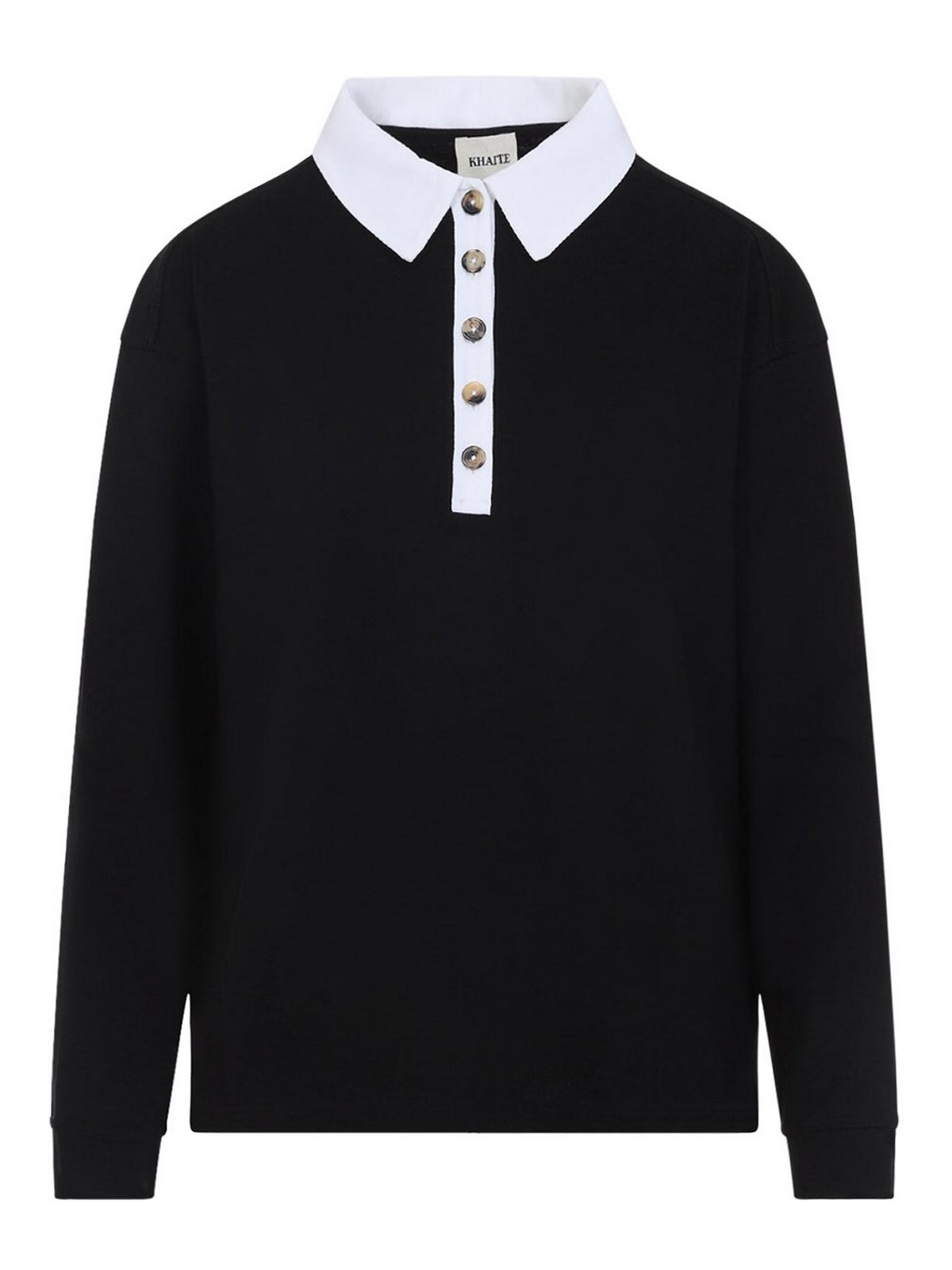 Fedele top in seta nera Khaite. Polo a maniche lunghe realizzata in pura seta nera, caratterizzata da colletto bianco a contrasto, abbottonatura frontale, spalle scese e orlo dritto.