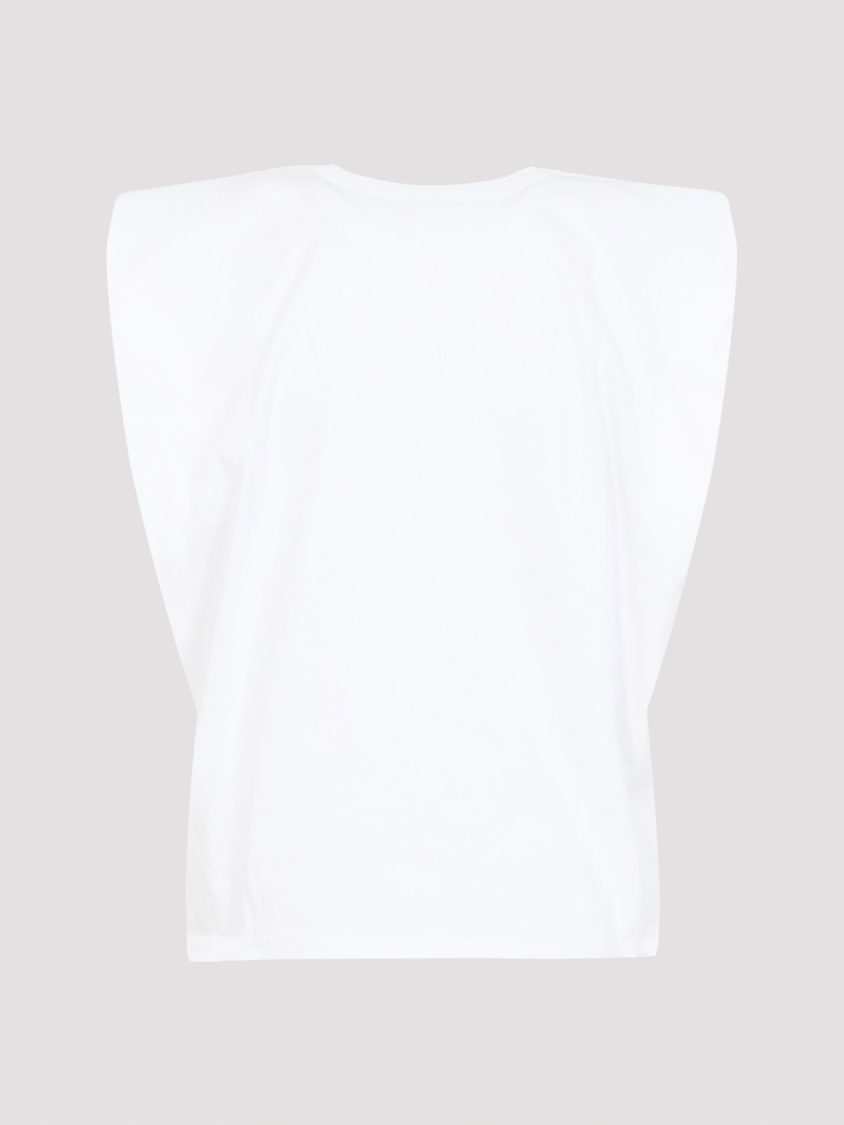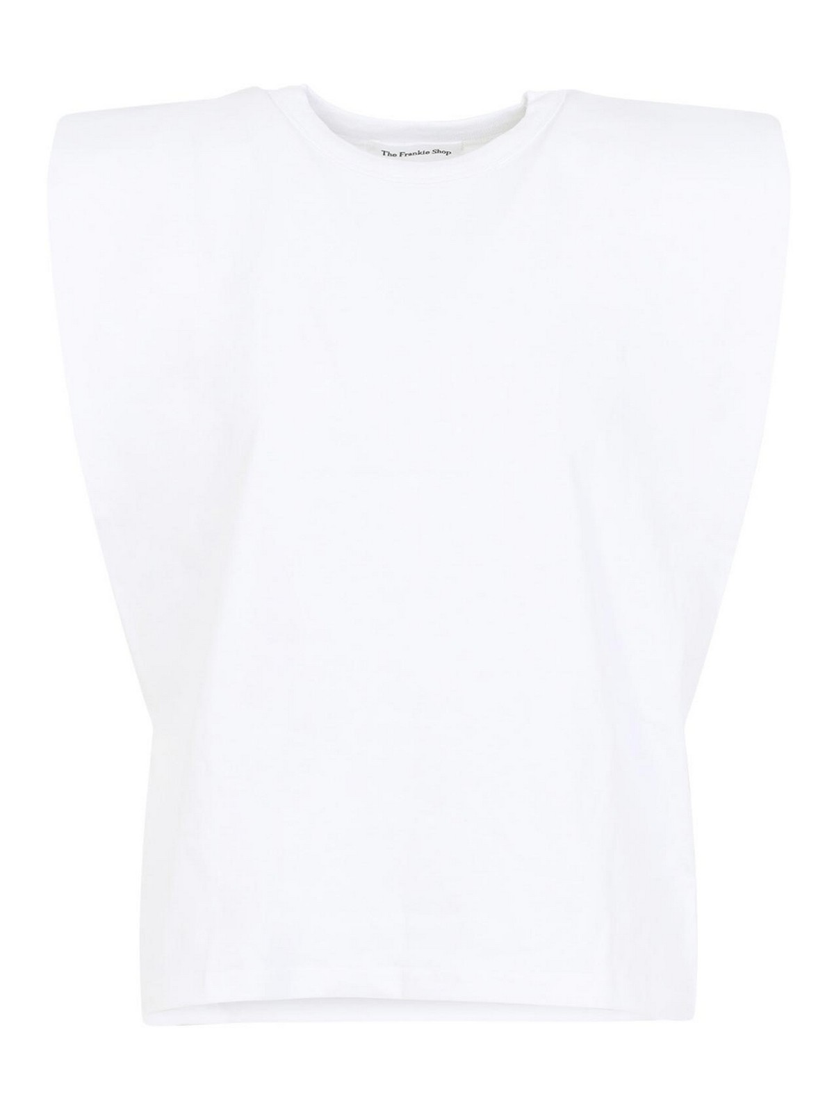 T-shirt in cotone bianco con spalle imbottite The Frankie Shop Eva. realizzato in leggero jersey di cotone bianco, design senza maniche con giromanica abbassato, spalle imbottite, scollo rotondo a costine, vestibilità comoda.